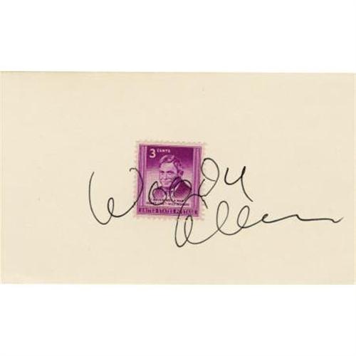 <B>Woody Allen Autograph.</B></I> A 5" x 3" card, with a three-cent postage stamp affixed, signed by the Academy Award-winning director/actor in black ink. Allen's autograph extends across the face of the stamp and is large and clean. In Excellent condition.<BR><BR><b>Shipping:</b> Flat Material, Small (<a target="_blank" href="http://www.heritageauctions.com/common/shipping.php">view shipping information</a>)