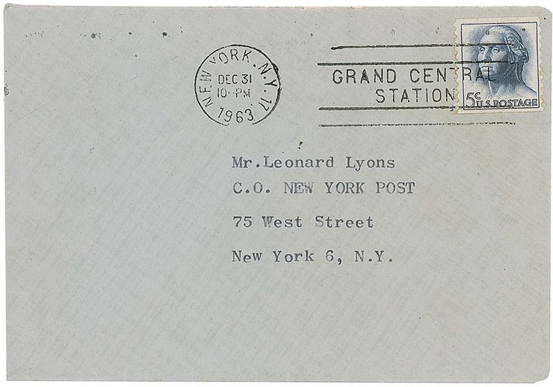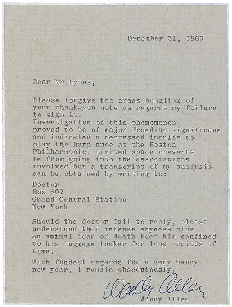 TLS, one page, 5 x 7, December 31, 1963. Letter to Leonard Lyons of the New York Post. In full: “Please forgive the crass bungling of your thank-you note as regards my failure to sign it. Investigation of this phenomenon proved to be of major Freudian significance and indicated a repressed impulse to play the harp nude at the Boston Philharmonic. Limited space prevents me from going into the associations involved but a transcript of my analysis can be obtained by writing to: Doctor, Box 802, Grand Central Station, New York. Should the doctor fail to reply, please understand that intense shyness plus an animal fear of death keep him confined to his luggage locker for long periods of time.” In fine condition. Accompanied by the original mailing envelope.