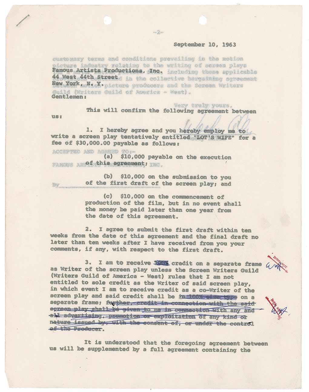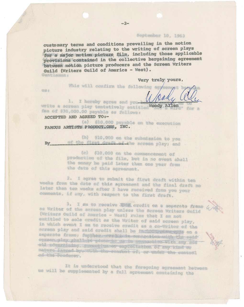 DS, two pages, 8.5 x 11, September 10, 1963. Agreement between Allen and Famous Artists Productions for Allen to write a screenplay for a film tentatively entitled Lot’s Wife, for a fee of $30,000. Signed on the second page in blue ballpoint by Allen, who has also initialed the first page twice. Lot’s Wife would be renamed What’s New Pussycat?, and would mark Allen’s film debut, as well as his first produced script. In fine condition, with staple and punch holes to top, and a few light creases.