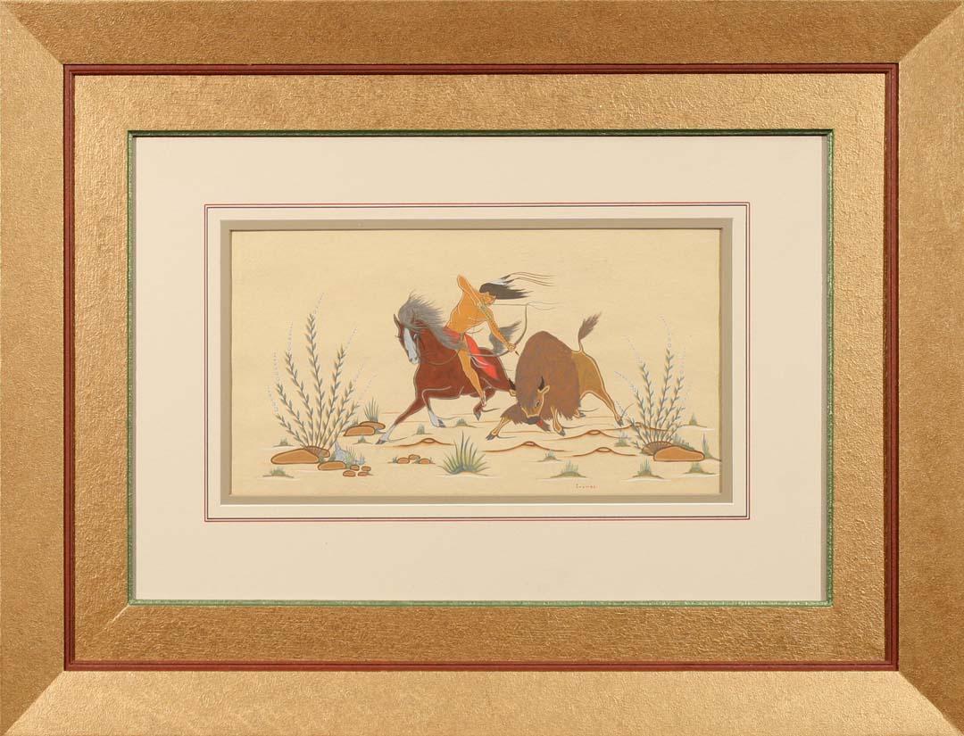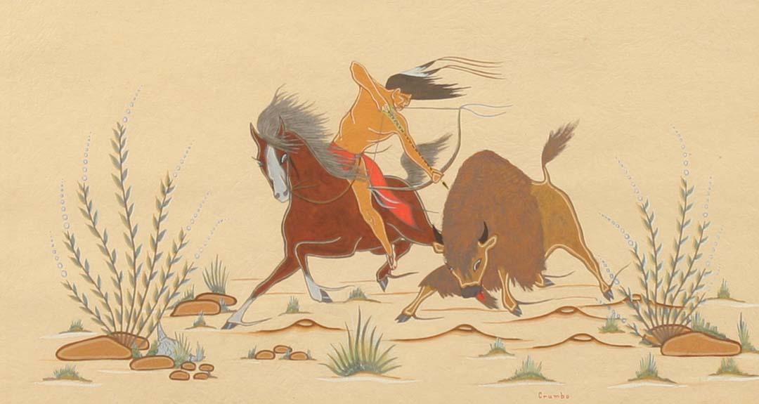 Woody Crumbo (1912-1989). The Hunt. 9" x 15" gouache. Signed lower right. (est $3,000-4,000). For condition reports please visit: www.auctioninsantafe.com/cr2011.pdf