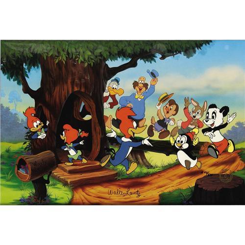 <B>"Woody Greets His Friends" Limited Edition Hand Painted Cel #248/500 Original Art (Walter Lantz Productions, 1989).</B></I> This limited edition of 500 cels is an adaptation from a mural created by Walter Lantz artist, Frank McSavage, for the Doris Stein Eye Research Center at U.C.L.A. It features Woody, Knothead, Splinter, Chilly Willy, Andy Panda, Oswald Rabbit, Homer Pigeon, Wally Walrus, and Buzz Buzzard. The line drawing was transferred directly on to the cel, and hand painted. The watercolor background is reproduced by lithography. The art has an image area of 15" x 9.5", and is in Excellent condition. Includes Walter Lantz's signature. <BR><BR><B>Important notice:</B> Heritage usually auctions material at the rate of 200-250 lots per hour. On some occasions eBay Live bid software or the Internet may not be able to keep up with the pace of the auction. We recommend placing a realistic absentee bid now as insurance to avoid disappointment. Occasionally the auctioneer may eliminate or reject an eBay Live bid, and the auctioneer may also reopen a lot after the close of the eBay live bidding (usually because we missed an audience bid), and may reject your bid even if it shows you as the winning bidder. By bidding via eBay Live, you agree that Heritage may award the lot to another bidder at its sole discretion under the circumstances described above or any other reasonable circumstances. Since eBay bids are not shown to us until we open the lot on the floor, we treat those bids just like floor bids. In most cases the floor responds before the eBay bid is presented to us, due to Internet lag time, so for consistency we have made it a policy that floor bids are always considered first over tie eBay live bids. Also please note that all Heritage lots purchased through eBay Live carry a 22.5% Buyer's Premium. Please make sure you read the Terms and Conditions before you bid. This lot is being auctioned in conjunction with a live floor auction by Heritage Auction Galleries. All final auction and invoice information will be supplied by Heritage Auction Galleries, and all other information should be considered preliminary. Lot:41001 <BR><BR><B>Winning Notification and Billing:</B> After the FINAL session in this auction is complete, Heritage will send e-mail and snail mail invoices. This process normally takes several days. All final auction and invoice information will be supplied by Heritage Auction Galleries, and all other information should be considered preliminary. <BR><BR>This auction will be conducted on a live auction floor and over the Internet through eBay Live. If you choose to place an absentee bid, please take a moment to <font color='#0000ff'><u><a href='http://pages.ebay.com/liveauctions/help/before/laabsentee.html'>learn how eBay Live absentee bidding works</a></u></font><font color='#000000'>