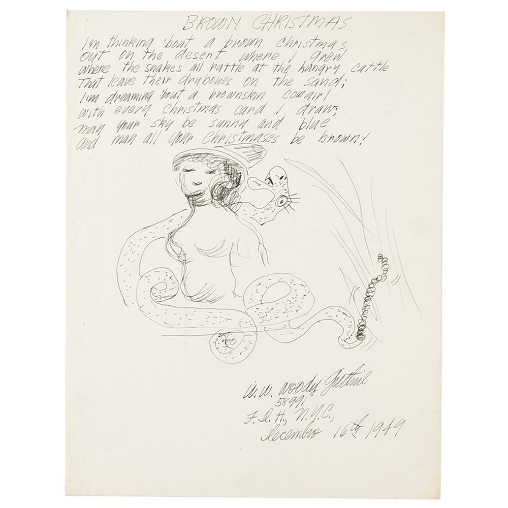 Amazing autograph lyrics for an apparently unpublished song by Woody Guthrie, one page, 8.5 x 11, titled at the top, "Brown Christmas,” and signed at the bottom, “W. W. Woody Guthrie, 5899, F.D.H., N.Y.C., December 16th 1949,” who added a large original sketch of a rattlesnake coiling around a woman, imagery in keeping with the song’s lyrics, which read, in full: “I’m thinking ‘bout a brown Christmas / out on the desert where I grew / where the snakes all rattle at the hungry cattle / that leave their dry bones on the sand; / I’m dreaming ‘bout a brownskin cowgirl / with every Christmas card I draw; may your sky be sunny and blue / and may all your Christmases be brown!” In fine condition, with staple holes along the left edge. When Guthrie died in 1967, the folk song-writing legend left behind more than 3,000 songs, most of them unpublished and unrecorded. An amusing take on Irving Berlin and Bing Crosby’s classic 1942 song ‘White Christmas,’ reimagined by Guthrie with lyrics geared towards a Southwestern audience accustomed to holidays with more sand than snow. Guthrie’s desert-themed doodles lend wonderful folk story imagery, with his “brownskin cowgirl,” twisting rattlesnake, and apparent nearby campfire combining for a most rare and desirable display piece.