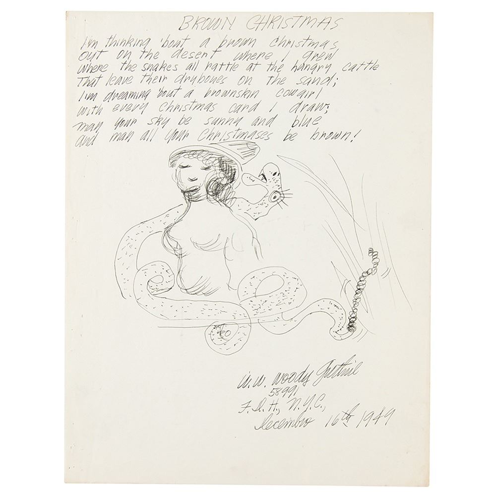 Amazing autograph lyrics for an apparently unpublished song by Woody Guthrie, one page, 8.5 x 11, titled at the top, "Brown Christmas,” and signed at the bottom, “W. W. Woody Guthrie, 5899, F.D.H., N.Y.C., December 16th 1949,” who adds a large sketch of a rattlesnake coiling around a woman, imagery in keeping with the song’s lyrics, which read, in full: “I’m thinking ‘bout a brown Christmas / out on the desert where I grew / where the snakes all rattle at the hungry cattle / that leave their dry bones on the sand; / I’m dreaming ‘bout a brownskin cowgirl / with every Christmas card I draw; may your sky be sunny and blue / and may all your Christmases be brown!” In fine condition, with staple holes along the left edge. When Guthrie died in 1967, the folk song-writing legend left behind more than 3,000 songs, most of them unpublished and unrecorded. An amusing take on Irving Berlin and Bing Crosby’s classic 1942 song ‘White Christmas,’ reimagined by Guthrie with lyrics geared towards a Southwestern audience accustomed to holidays with more sand than snow. Guthrie’s desert-themed doodles lend wonderful folk story imagery, with his “brownskin cowgirl,” twisting rattlesnake, and apparent nearby campfire combining for a most rare and desirable display piece.