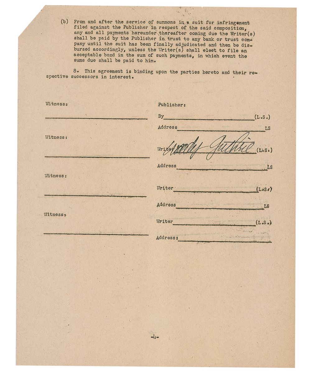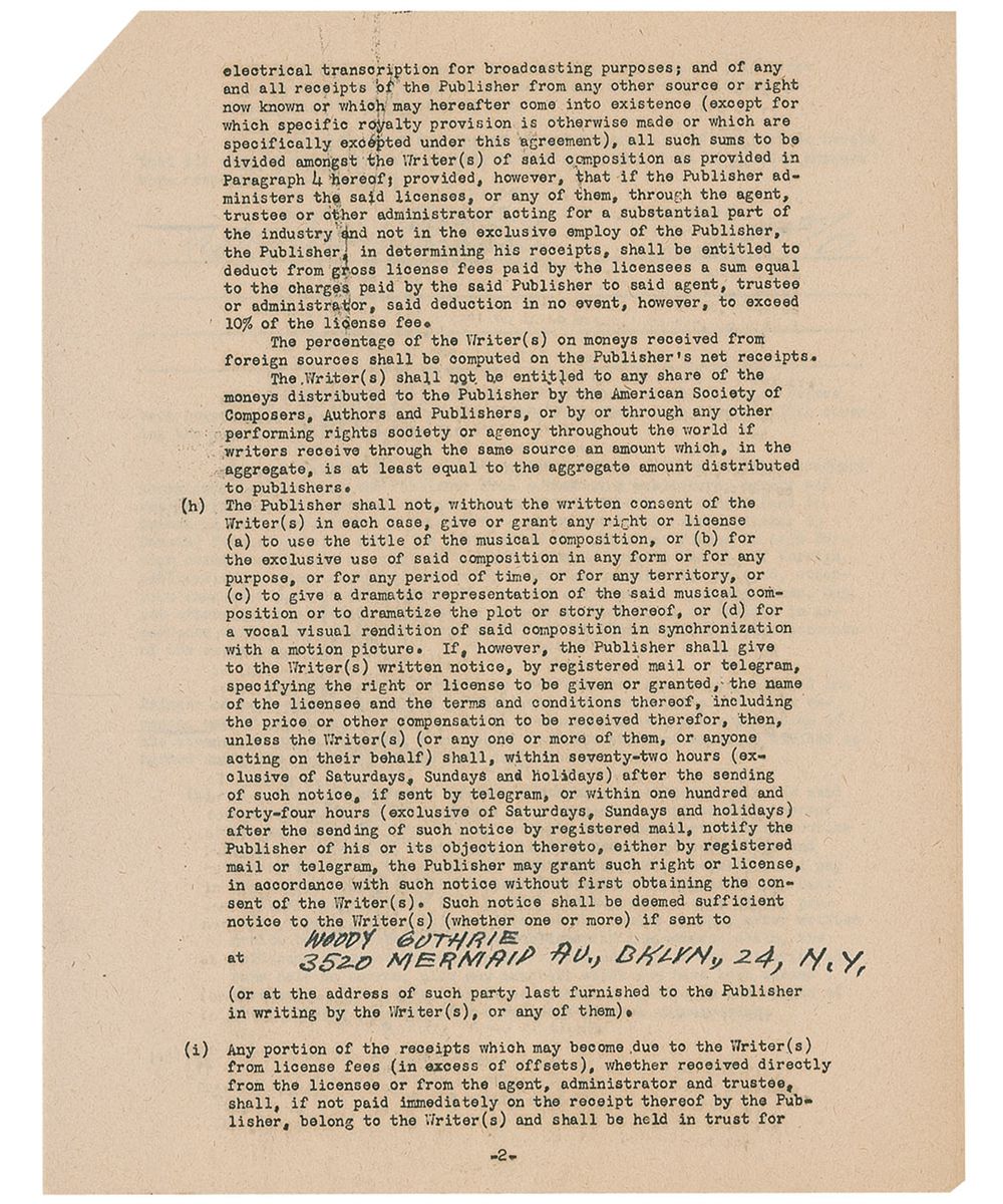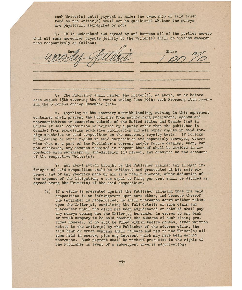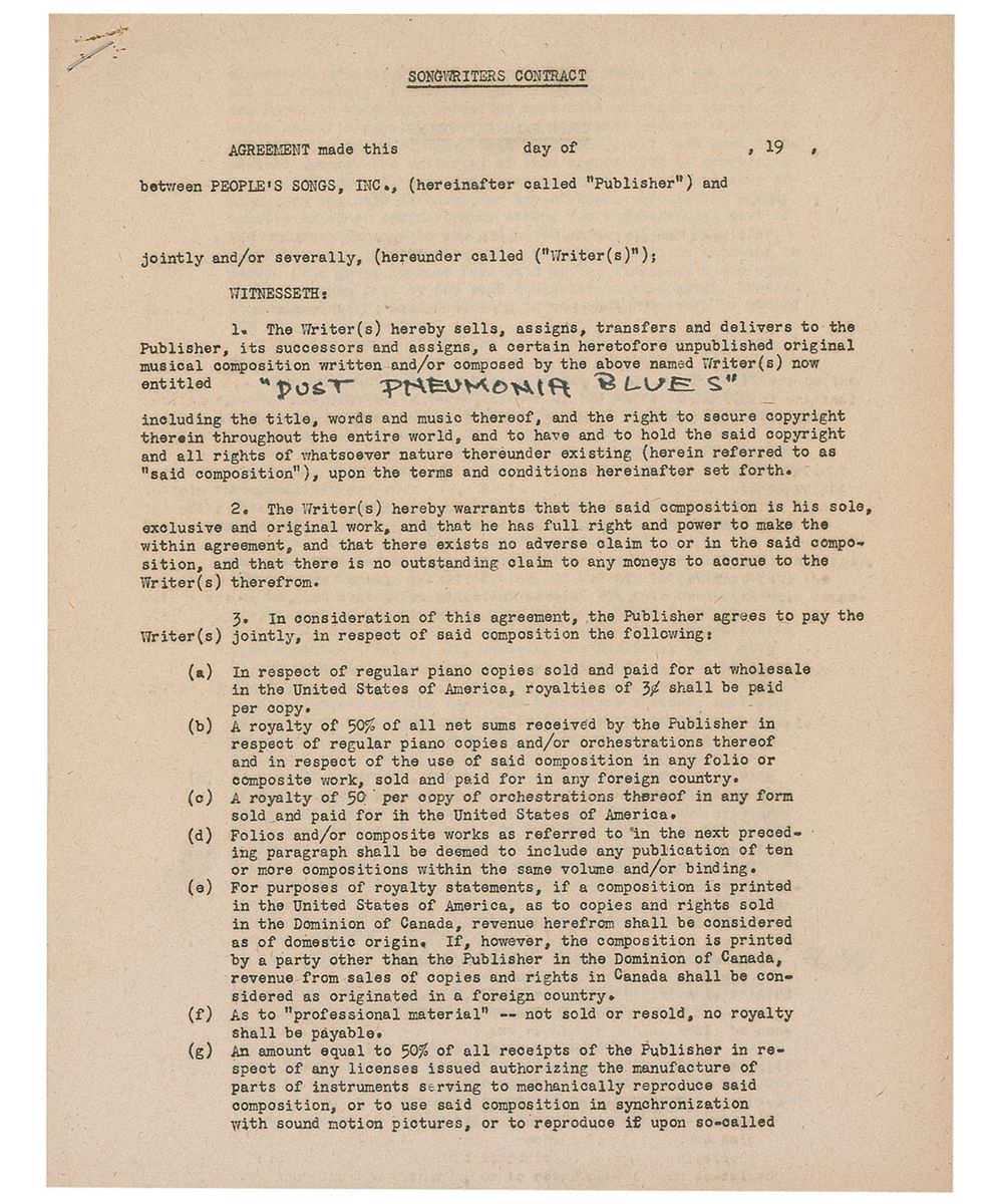 Singer-songwriter (1912–1967) best known for such iconic folk songs as ‘This Land Is Your Land,’ which glories in the spirit of the American landscape and its people DS, four pages, 8.5 x 11, no date. Agreement between Guthrie and People’s Songs, Inc., in which Guthrie signs over all his rights to the song ‘Dust Pneumonia Blues.’ He pens in the song title on the first page. On the second page, he prints his name and Brooklyn, New York address in the notification line near the bottom. On page three, section four reads, “It is understood and agreed by and between all the parties hereto that all sums hereunder payable jointly to the Writer(s) shall be divided amongst them respectively as follows,” signing “Woody Guthrie 100%,” then signing one more time on the last page as a writer. Uniform toning to each page, a staple and staple hole to top left, as well as some scattered light soiling from carbon, otherwise fine condition.