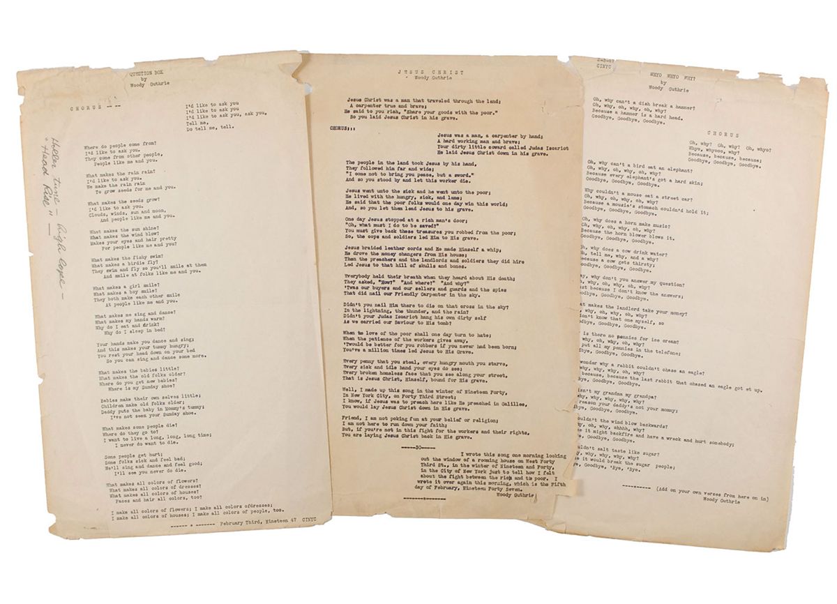 Three pages of typed lyrics, each 8.5 x 14, for the unpublished songs ‘Question Box,’ and ‘Jesus Christ,’ and ‘Whyo Whyo Why?,’ which appears on Songs to Grow On. On the ‘Question Box’ sheet, Guthrie has added pencil notations to the left edge which read, “Holler tune—high hope—‘Head Rise.’” In very good condition, with uniform toning, areas of paper loss to edges, scattered creases, and several tape repairs.