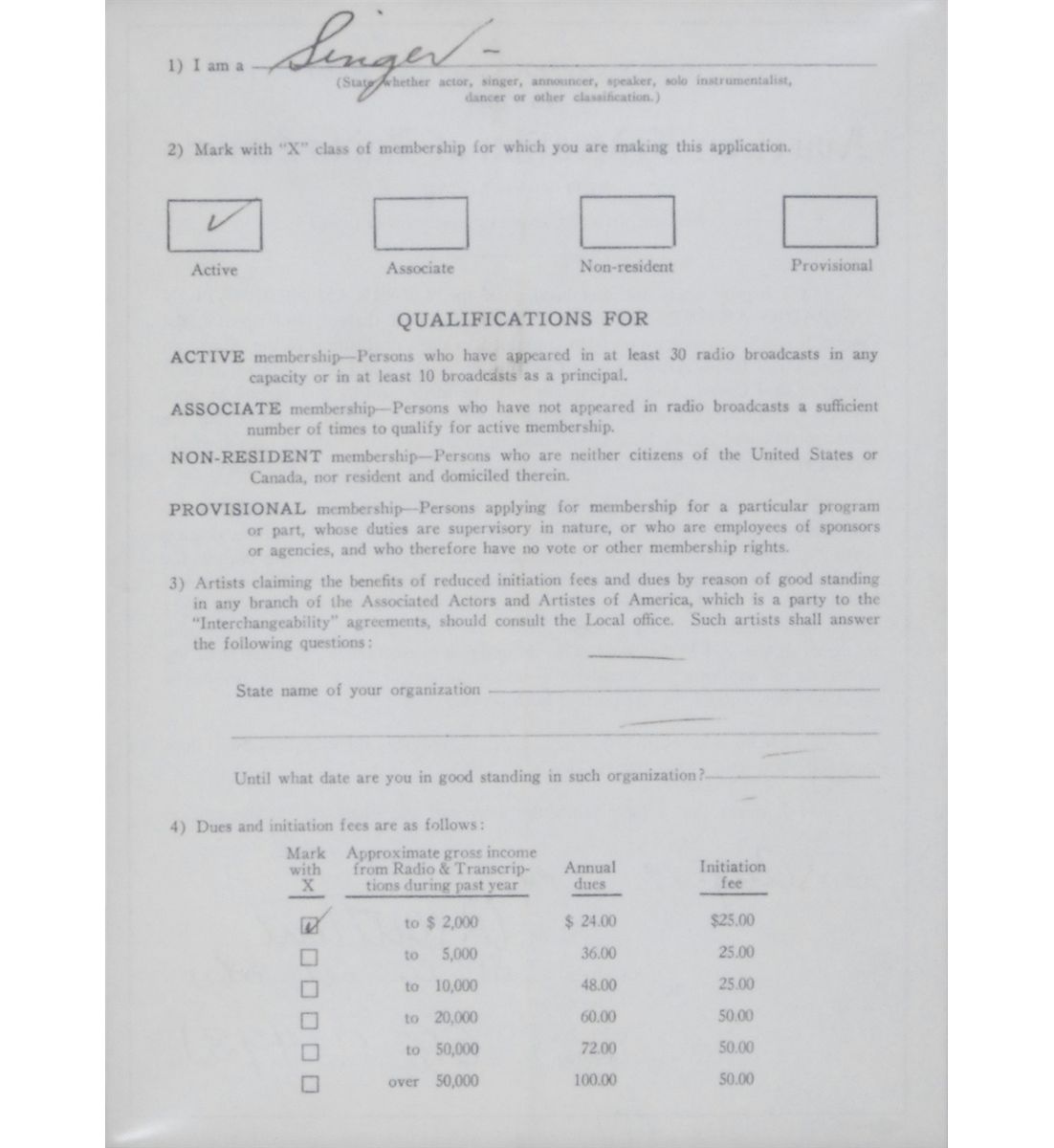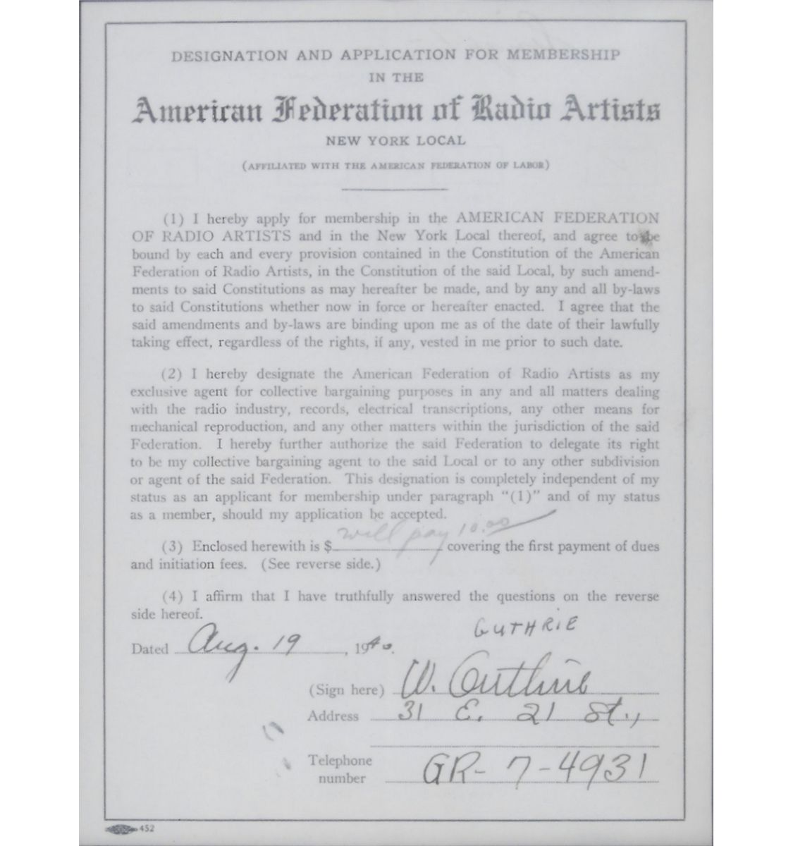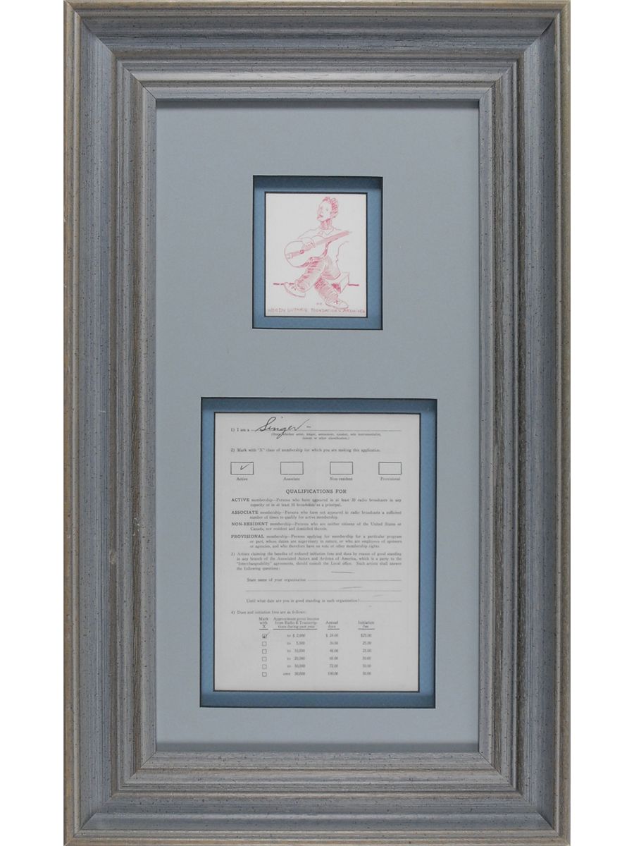 Historic DS, signed “W. Guthrie,” one page both sides, 6 x 8, August 19, 1940. Guthrie’s 1940 application for AFRA membership, filled out by Guthrie, signing his name, and adding his address and phone number on the front, and writing his occupation on the reverse, “Singer.” At the bottom of the reverse, he checks the box indicating his approximate gross income from radio and transcriptions as up to $200. Double-matted, shadow-boxed and framed with two images of Guthrie to an overall size of 14.25 x 25. In fine condition. On the day he joined the American Federation of Radio Artists, Guthrie and Burl Ives performed during the debut of the Back Where I Come From radio show on the CBS Network. Later on, in September of 1940, he hosted the radio program entitled Pipe Smoking Time, sponsored by the Model Tobacco Company, pulling in a handsome salary of $180.00 per week, allowing him to move the rest of his family to New York. The gig would be short-lived as Guthrie quit after seven shows, and finally packing his family and heading to California in 1941. An item of great musical importance, and an instance of Guthrie, a left wing folk singer, looking out for his professional well-being.