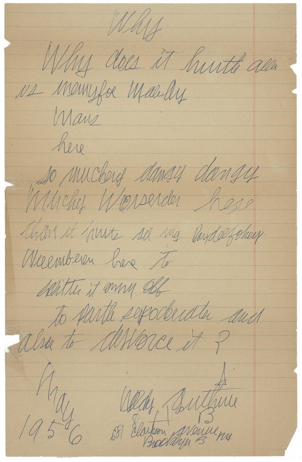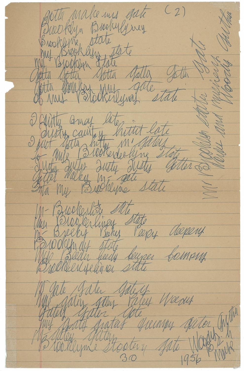 Two pages of handwritten lyrics on two 8.5 x 12 lined tan pages, both signed at the bottom, “Woody Guthrie,” dated May 1956, and written at the Brooklyn State Hospital, but never recorded. Much of the text is undecipherable clearly showing the effects of Huntington's disease, for which he was hospitalized from 1956 to 1961. One page bears lyrics to a work entitled “Why,” and reads, in part: “Why does it hurt all us… so much of… here than it hurts all my (?) ever here to written it… (?)… and also to divorce it?" Second page bears 27 lines in Guthrie’s hand, and reads, in part: “Gotta make my gate, Brooklyn, Brooklyn my, Brooklyn state, my Brooklyn state.” Second page also bears a second Guthrie signature along right side. In very good condition, with tape repair to complete bisecting horizontal separation to second page, uniform toning, several other archival tape repairs to reverse of both pages, and some scattered edge chipping. The theme of pain and escape is palpable in these two pages, composed as the singer optimistically—perhaps too optimistically—entertained the notion of hitting the road to perform while combatting a debilitating neurodegenerative disorder. In May 1952, Guthrie began to fall ill, and by September was diagnosed with Huntington's disease. Two years later, with the effects of the disease making him no longer able to function, Guthrie checked into Brooklyn State Hospital. On May 23, 1956, shortly after putting these thoughts on the pages offered here, Guthrie checked himself out of the facility and planned to tour, but within days was arrested for vagrancy in New Jersey. He was involuntarily committed to Greystone Park Hospital, a psychiatric hospital, and transferred to Brooklyn State five years later. An amazing example as the legendary songwriter physically struggled to commit his emotional pain to paper.