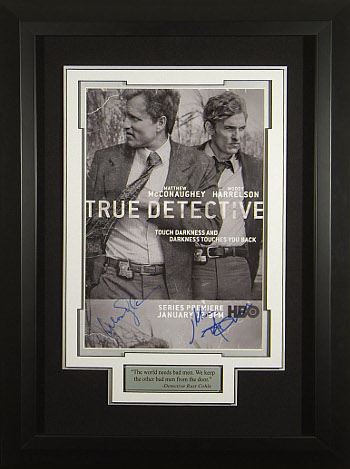 The first season of True Detective, an American anthology crime drama television series created by Nic Pizzolatto, premiered on January 12, 2014 on the premium cable network HBO. Its principal cast consisted of Matthew McConaughey & Woody Harrelson. The season had eight episodes; its initial airing concluded on March 9, 2014. It was a candidate for numerous television awards, including a Primetime Emmy Award nomination for Outstanding Drama Series and a Golden Globe Award for Best Miniseries or Television Film, and won several other honors recognizing its writing, cinematography, direction, and acting. This is an signed Publicity Masterprint 11x17 inch movie poster with museum Quality Custom Black Framing as shown to an overall size of 22x30. Matthew McConaughey & Woody Harrelson have hand signed this poster. The perfect addition to complement any Home Theater Collection. Witnessed, Examined, and Certified Authentic (Lifetime) by Millionaire Gallery, Inc.