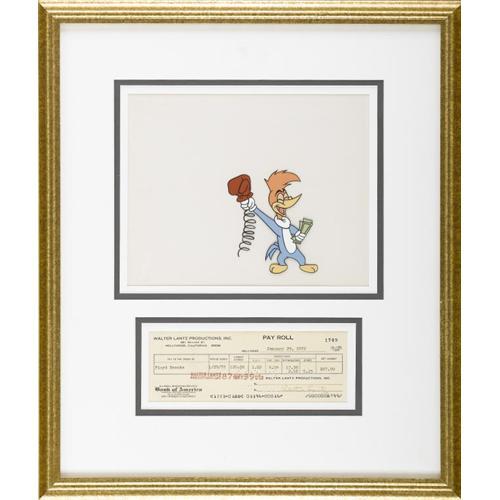 <B>Woody Woodpecker Production Cel with Walter Lantz Signed Payroll Check Original Art (Walter Lantz Productions, undated).</B></I> Woody Woodpecker holds a spring-loaded boxing glove, in this knockout of a cel, which has an image area of 10" x 8". The work is framed and in Excellent condition. Also included is a payroll check from Walter Lantz Productions, with Walter Lantz's signature.