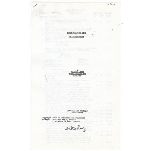 <B>Woody Woodpecker "Round Trip to Mars" Script (Universal International, 1957).</B></I> Woody tricks a scientist into thinking he's landed on Mars, and that Woody is a Martian, in this Walter Lantz "Cartune." Consists of 9 sheets stapled together at the upper left corner. Measures 8.5" x 14". In Very Good condition, and signed by Walter Lantz.