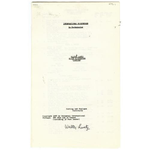 <B>Woody Woodpecker "Round Trip to Mars" Script (Universal International, 1957).</B></I> Woody gives Knothead and Splinter a history lesson, explaining their ancestors' roles in various world famous events, in this Walter Lantz "Cartune" from 1957. This script consists of 10 sheets of 8.5" x 14" paper stapled together at the upper left corner. In Very Good condition, and signed by Walter Lantz.