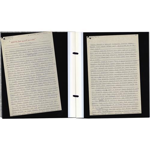 <B>"Woody the Giant Killer" and "Woody and the Beanstalk" Story Outline (Walter Lantz Productions, 1947-66).</B></I> Here are two Walter Lantz story outlines, including the one page "Woody the Giant Killer" outline, which was produced in 1947, and the four page, "Woody and the Beanstalk" outline, which was produced in 1966. Each page was hand-written on an 8.5" x 13" sheet of lined paper. Contained in a portfolio, the pages average in Very Good condition. <BR><BR><B>Important notice:</B> Heritage usually auctions material at the rate of 200-250 lots per hour. On some occasions eBay Live bid software or the Internet may not be able to keep up with the pace of the auction. We recommend placing a realistic absentee bid now as insurance to avoid disappointment. Occasionally the auctioneer may eliminate or reject an eBay Live bid, and the auctioneer may also reopen a lot after the close of the eBay live bidding (usually because we missed an audience bid), and may reject your bid even if it shows you as the winning bidder. By bidding via eBay Live, you agree that Heritage may award the lot to another bidder at its sole discretion under the circumstances described above or any other reasonable circumstances. Since eBay bids are not shown to us until we open the lot on the floor, we treat those bids just like floor bids. In most cases the floor responds before the eBay bid is presented to us, due to Internet lag time, so for consistency we have made it a policy that floor bids are always considered first over tie eBay live bids. Also please note that all Heritage lots purchased through eBay Live carry a 22.5% Buyer's Premium. Please make sure you read the Terms and Conditions before you bid. This lot is being auctioned in conjunction with a live floor auction by Heritage Auction Galleries. All final auction and invoice information will be supplied by Heritage Auction Galleries, and all other information should be considered preliminary. Lot:41001 <BR><BR><B>Winning Notification and Billing:</B> After the FINAL session in this auction is complete, Heritage will send e-mail and snail mail invoices. This process normally takes several days. All final auction and invoice information will be supplied by Heritage Auction Galleries, and all other information should be considered preliminary. <BR><BR>This auction will be conducted on a live auction floor and over the Internet through eBay Live. If you choose to place an absentee bid, please take a moment to <font color='#0000ff'><u><a href='http://pages.ebay.com/liveauctions/help/before/laabsentee.html'>learn how eBay Live absentee bidding works</a></u></font><font color='#000000'>