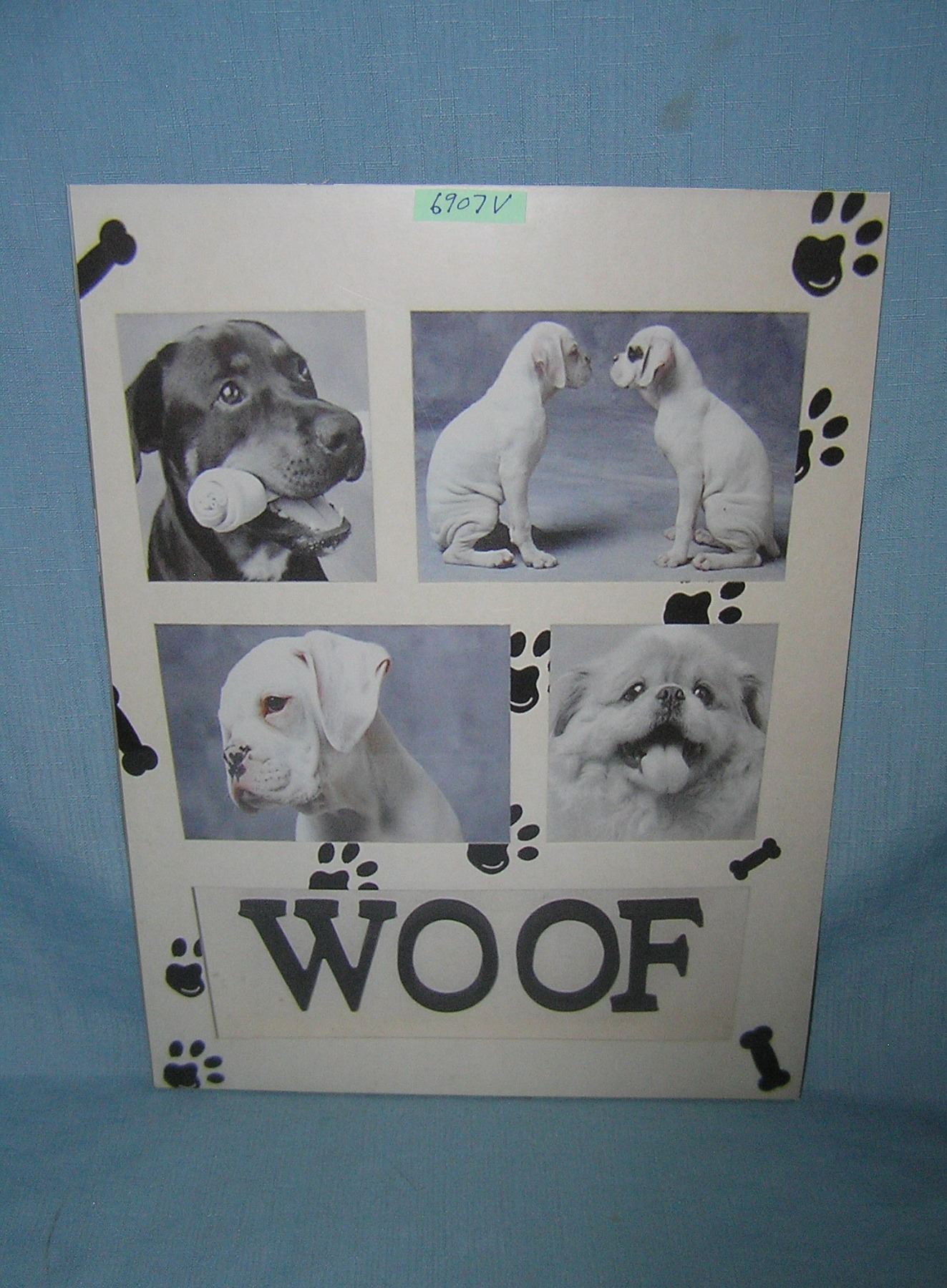 Woof multiple dog display sign retro style advertising sign printed on PVC hardboard these signs are auctioned for their decorative and display purposes 12 inches by 16 inches est. value $35.00-$40.00