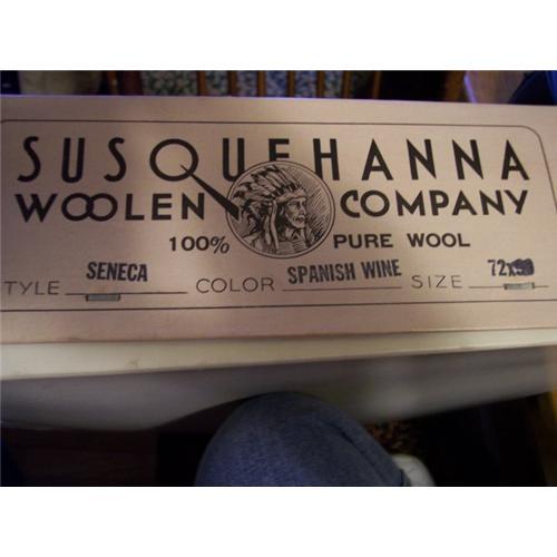 I believe this is new-old stock.It is a wool blanket from the SUSQUEHANNA WOOLEN COMPANY.It is 100% pure wool.Style is SENECA,color is SPANISH WINE and the size is 72x90(I think).Hard to make out the last number.Box has one piece of cardboard gone.The graphics are of an Indian on the one end,and the paper is still in between the blanket.