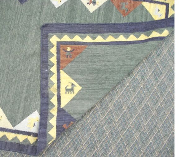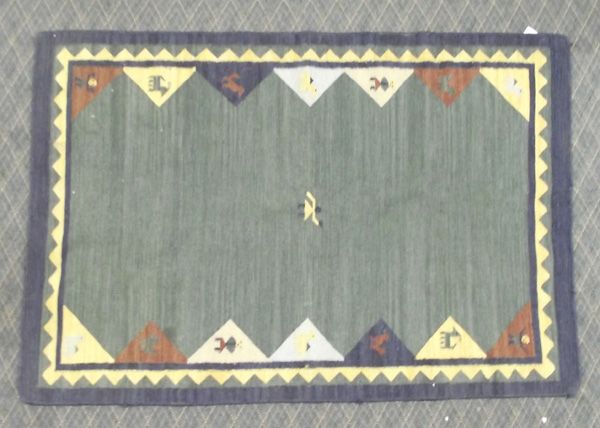 Wool Rug Woven in India.  Beautiful rich colors in this piece!  Prussian blue, sage, cream, grey & rust. Measures 68'' in length and 45'' wide.  A perfect size for an accent rug in any room!