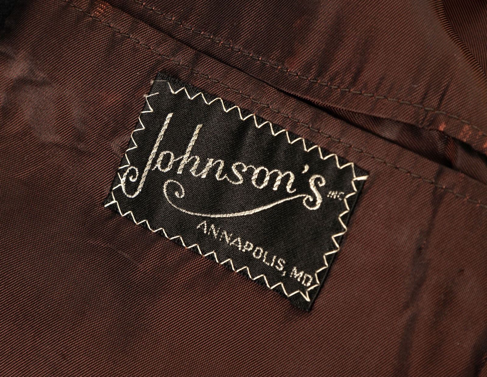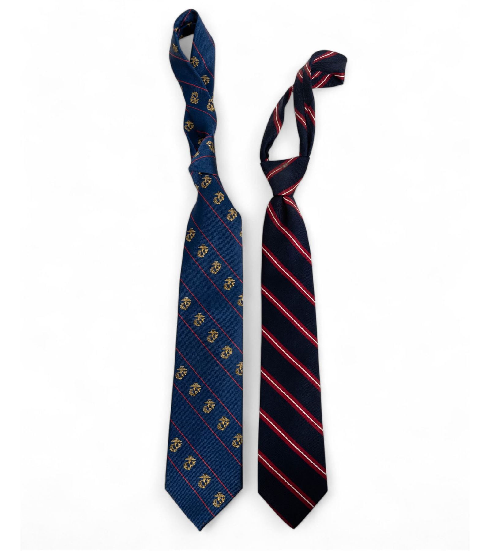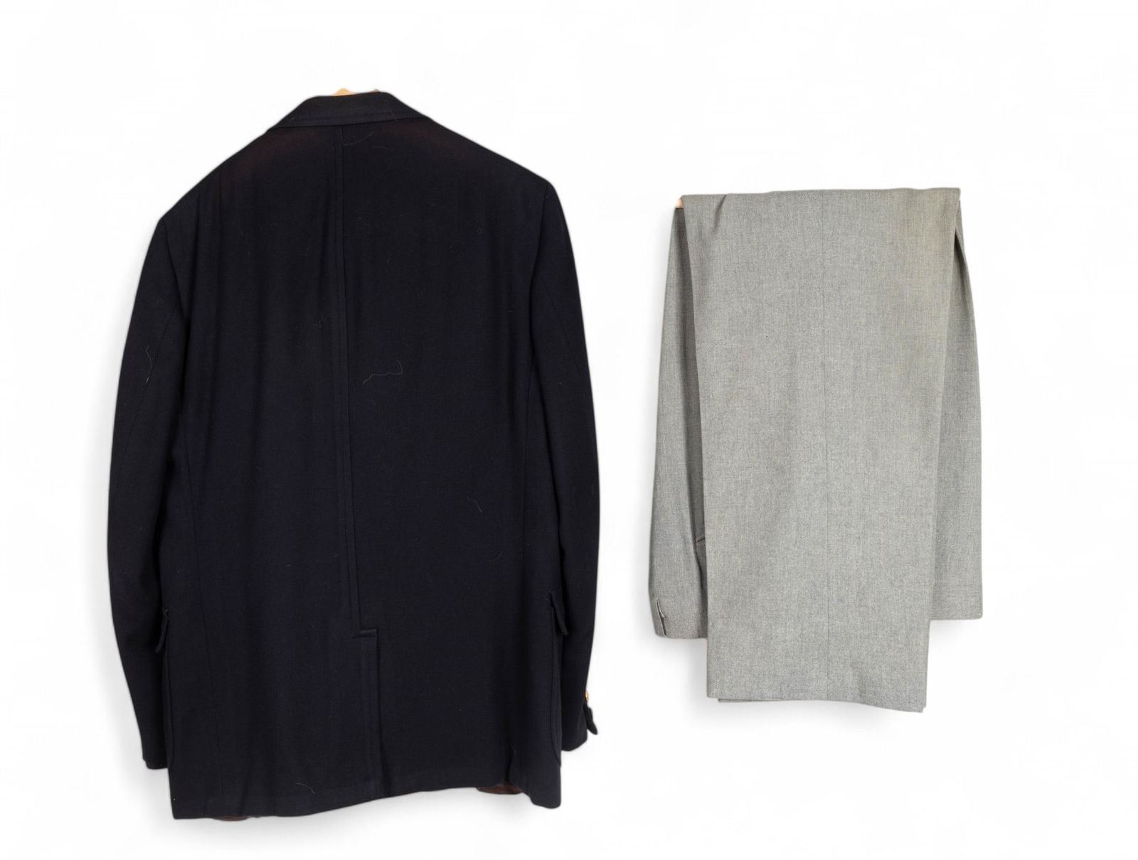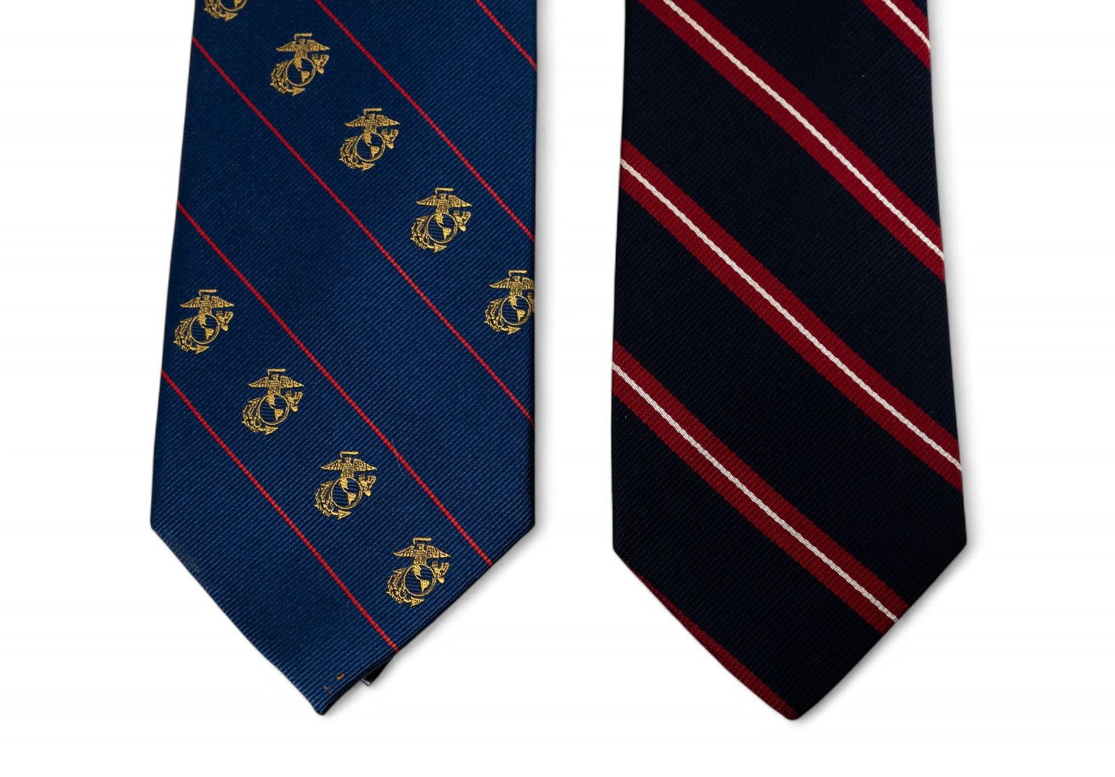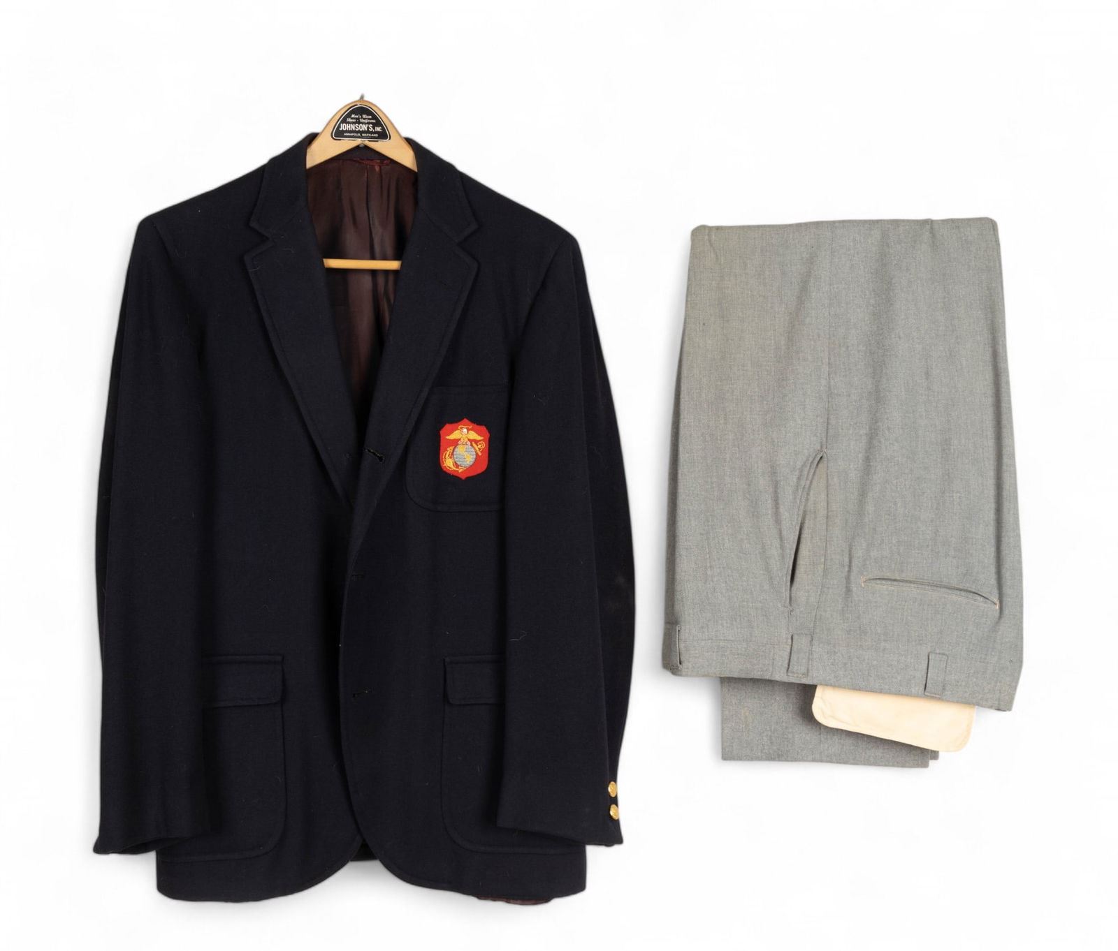 Navy blue sport jacket with United States Marine Corps insignia on breast pocket and brass eagle and anchor buttons tailor made from Johnson's Annapolis, MD 18.5" shoulders, grey wool slacks 36" waist 28" inseam, striped tie, and USMC globe and anchor patterned tie from Medals of America Ltd.