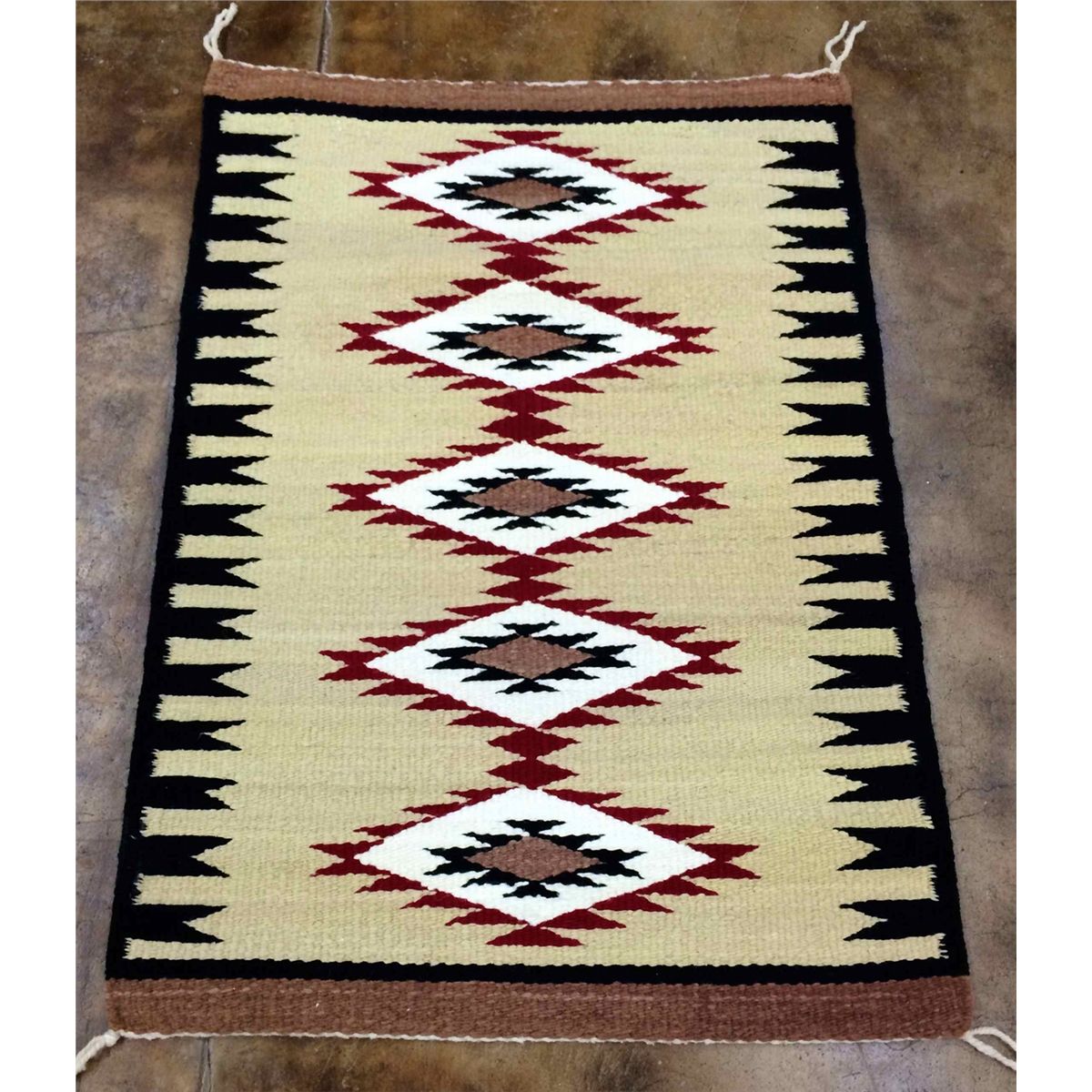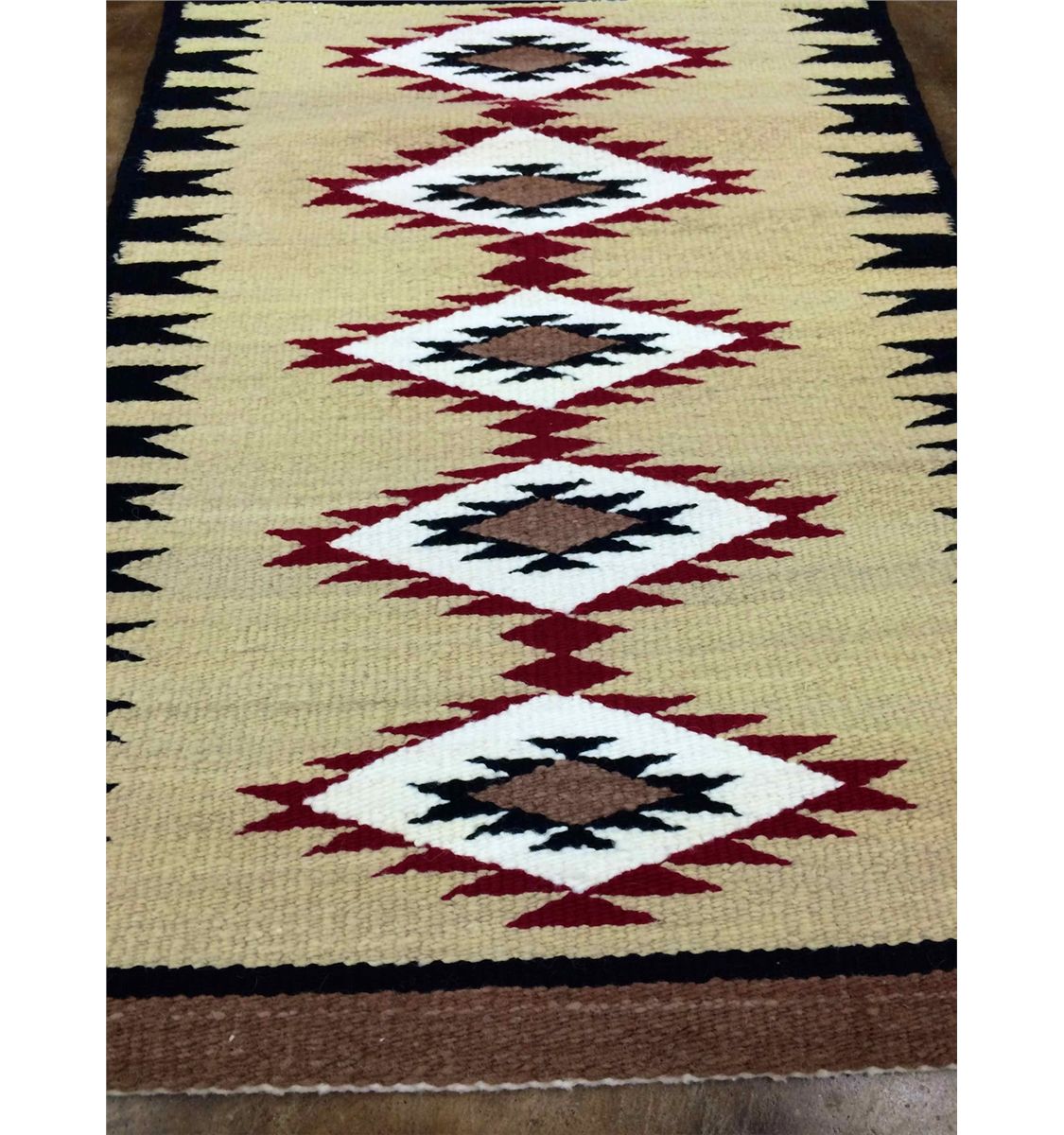 This great wool weaving is in excellent shape, and appears to be almost in new condition. It is done in the “south of the border style” and measures 31” wide by 43” long.