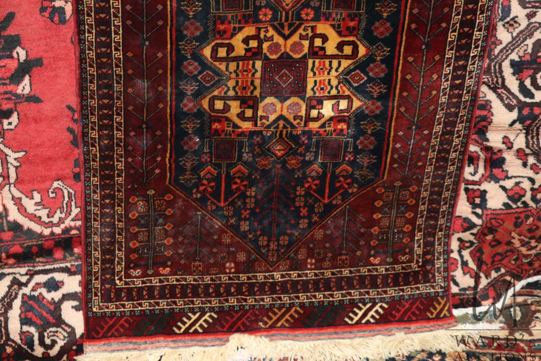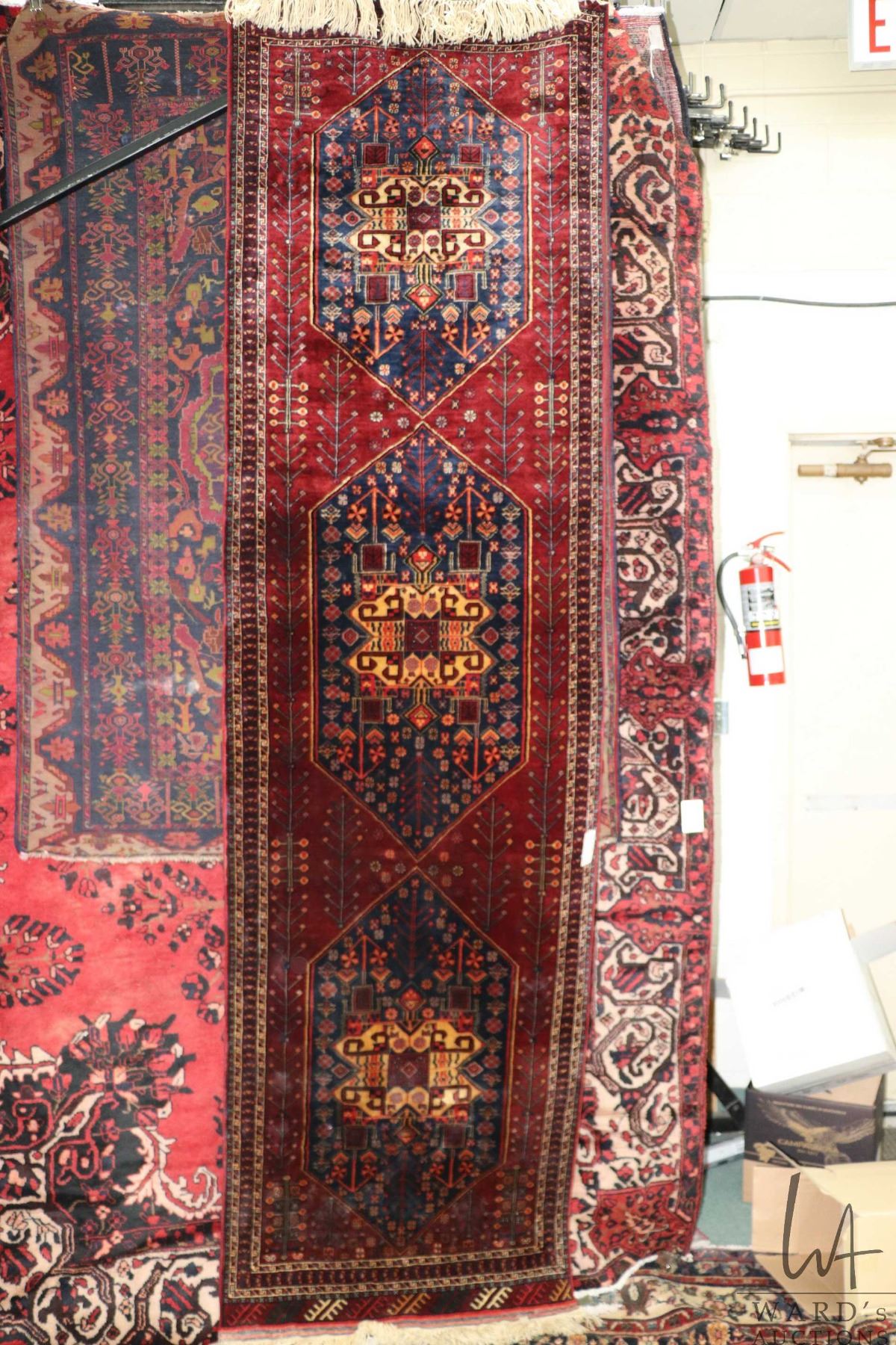 Wool carpet runner with triple medallion red background and highlights of blue, cream etc. 32" x 114"
