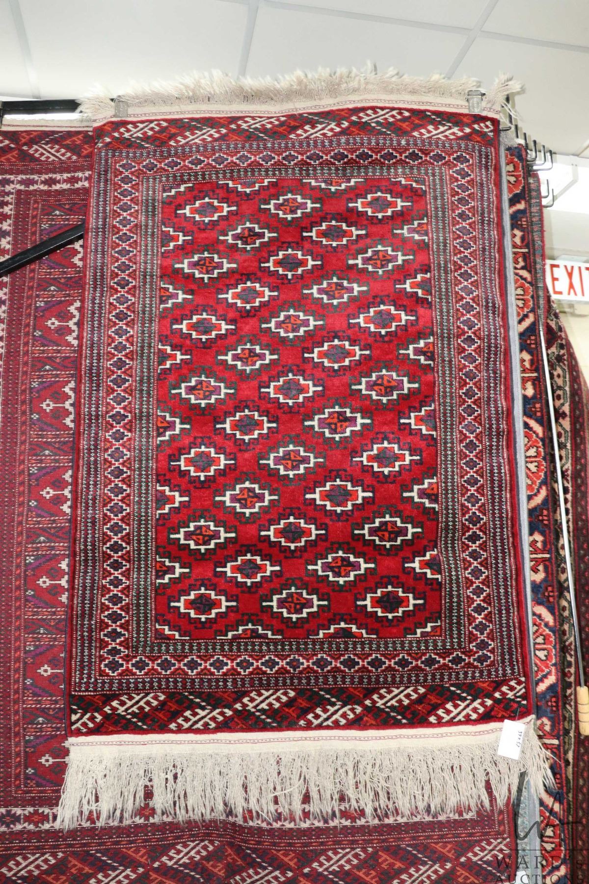 Wool scatter carpet with red background, geometric pattern and highlights of purple, black and cream, 39" X 57"
