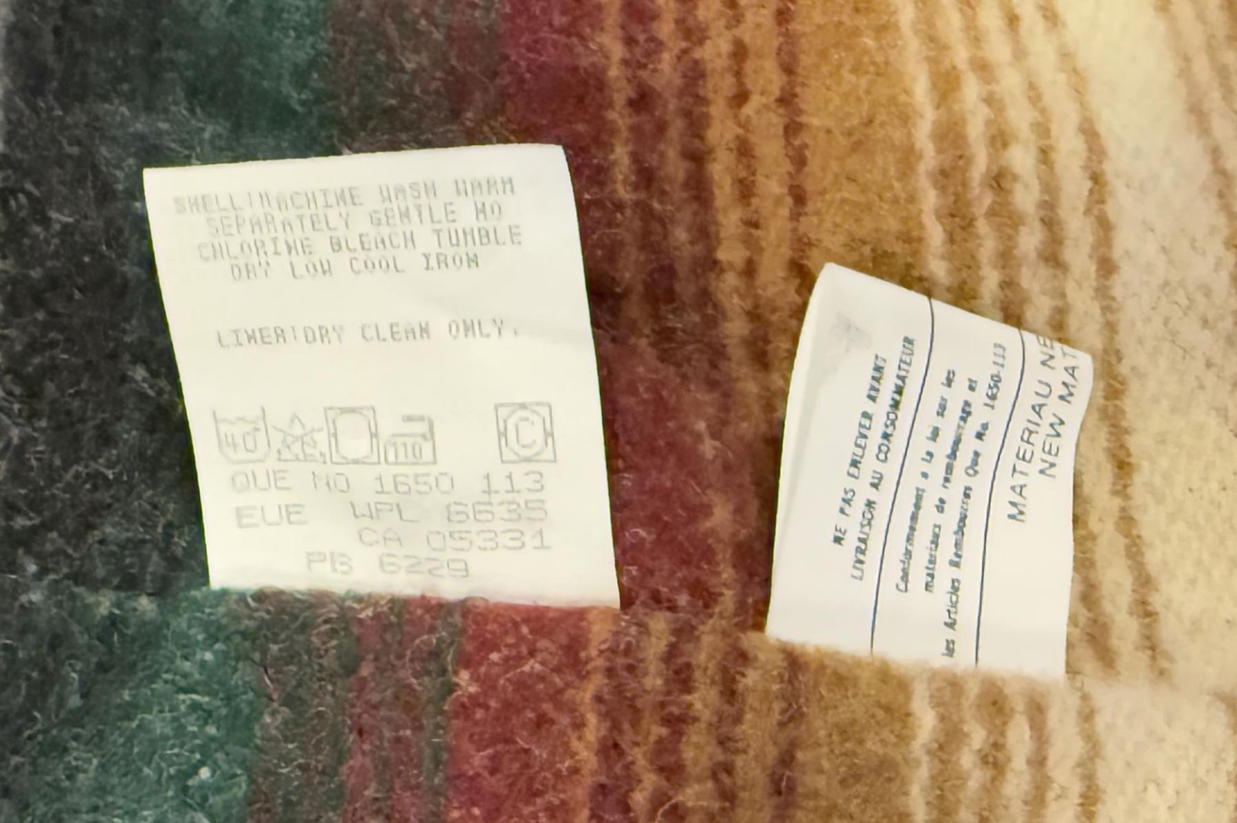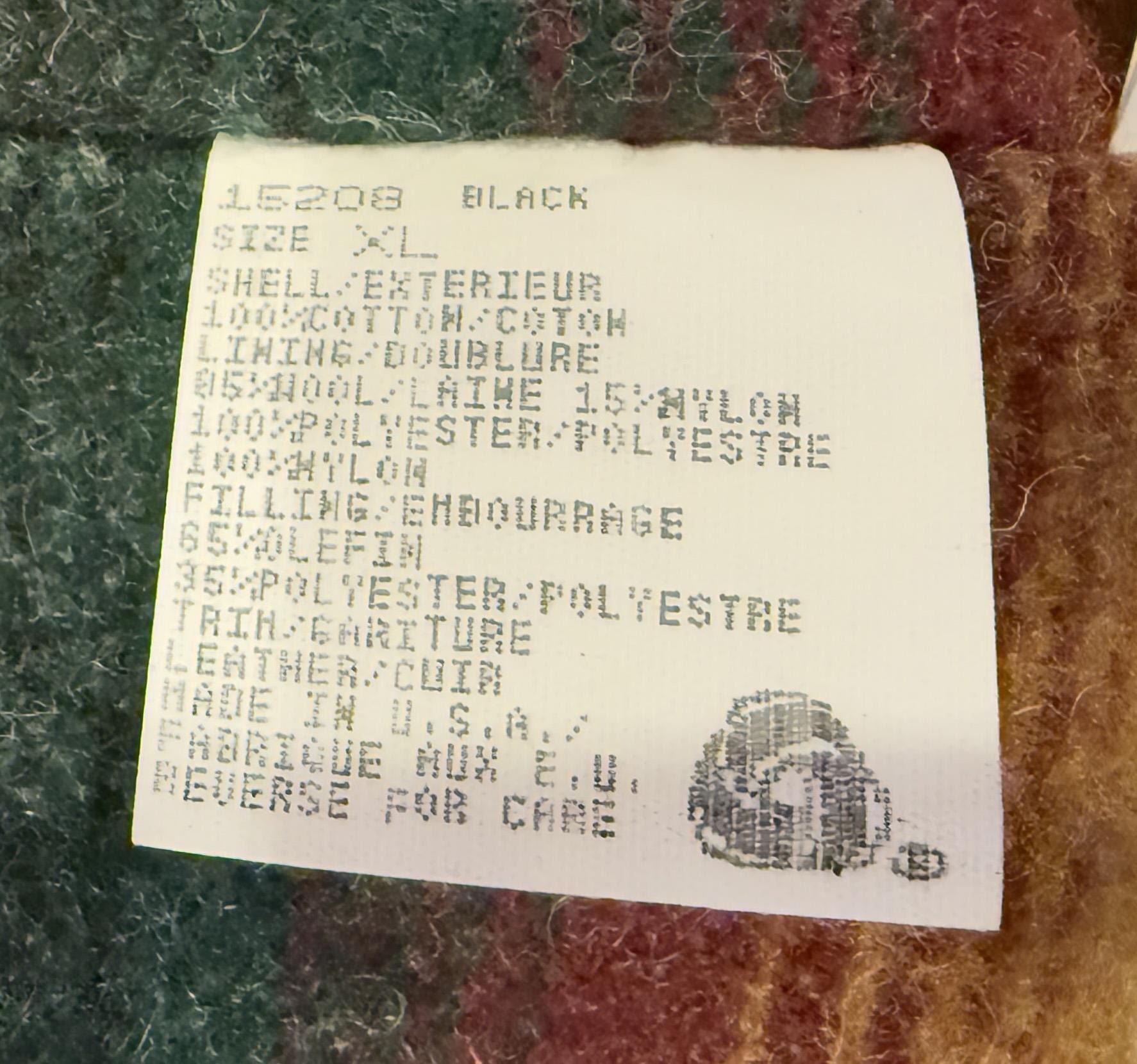 XL, cotton shell, 85% wool 15% nylon lining, made in USA.