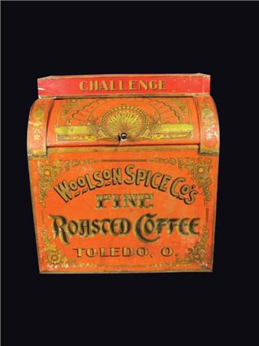 Woolsons Spice Co. Coffee Store Bin, Toledo, OH. Surface scratches, minor rust and crease at handle on lid otherwise fair condition. 19 1/2 X 21 1/2 X 12 1/2 inches.