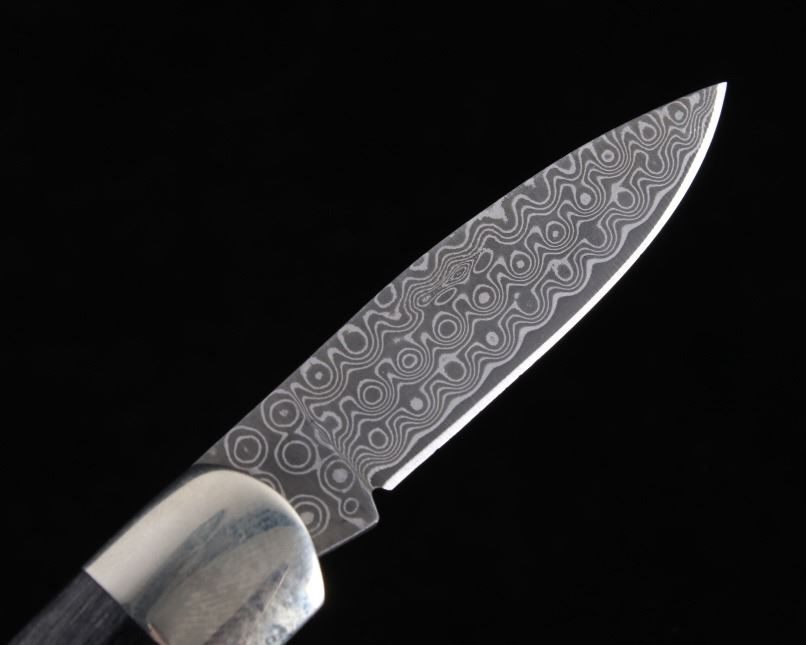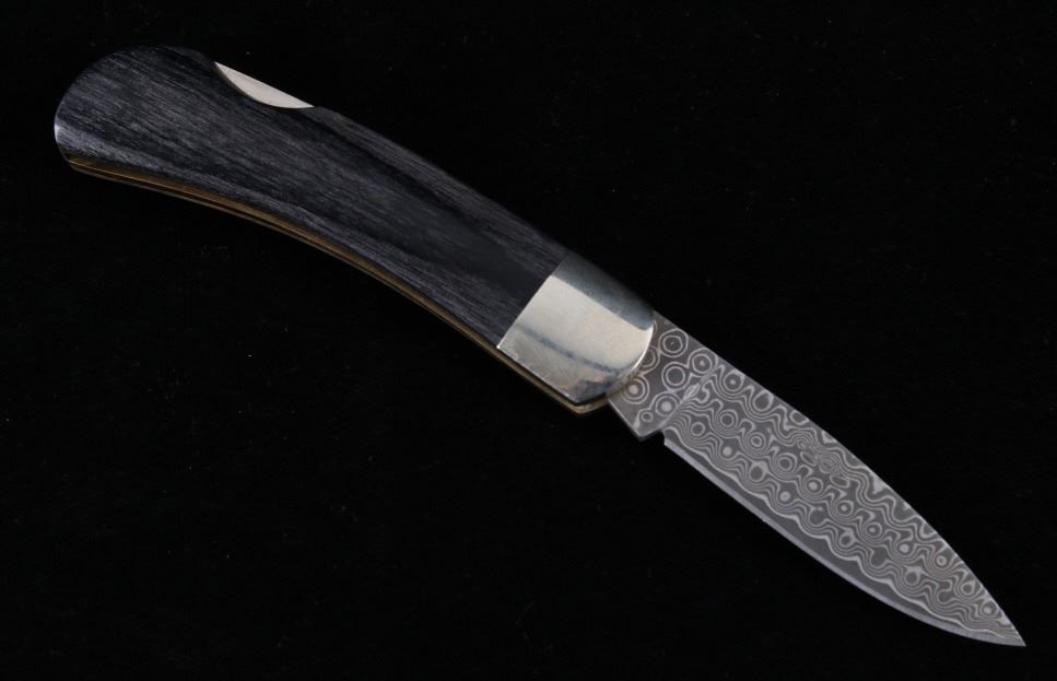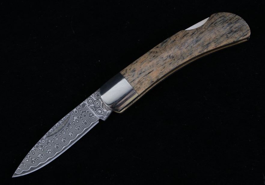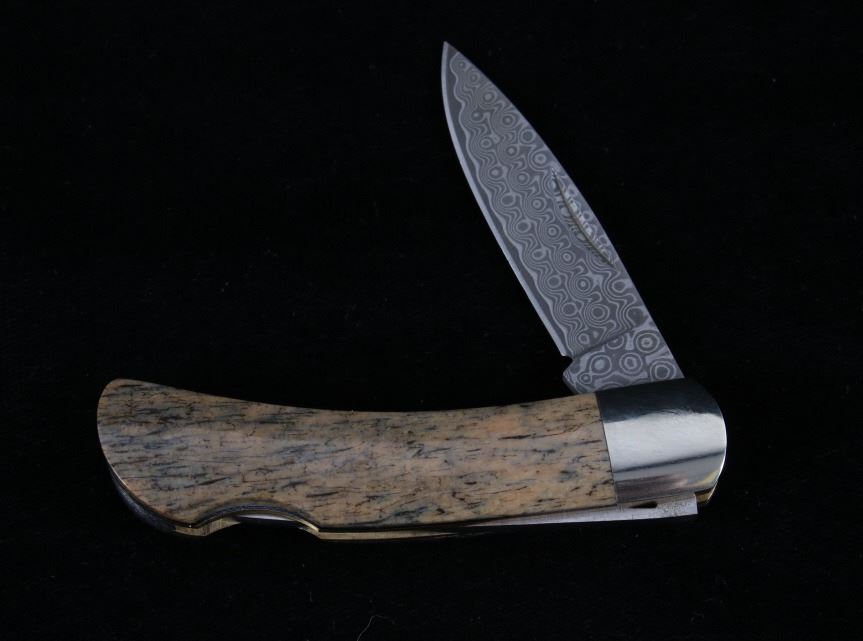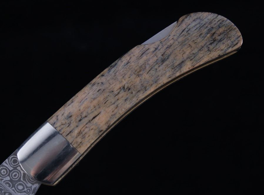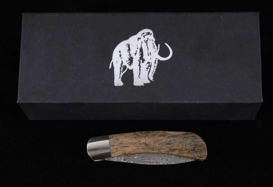This is an original handmade custom knife showing a folded forged raindrop Damascus blade with excellent premium Wooly Mammoth bone grips. The knife is from Santa Fe Stone-works. The grip shows a nice long piece of Wooly Mammoth bone. The blade shows a "Sanmai Damascus" which has a core of VG-10 "super stainless steel" with 16 layers of SUS410 high carbon stainless steel on each side making an over 33 layer work of art. This is a liner lock knife showing 5 1/4" long knife with the blade measuring 2 1/4". When closed it measures 3 1/4" long. The knife comes with the original Santa Fe Stoneworks Wooly Mammoth box and original paper work. This is a brand new knife.