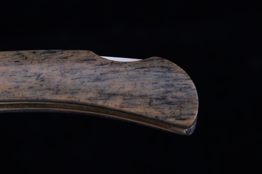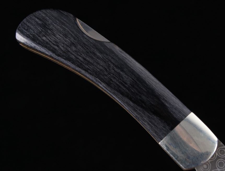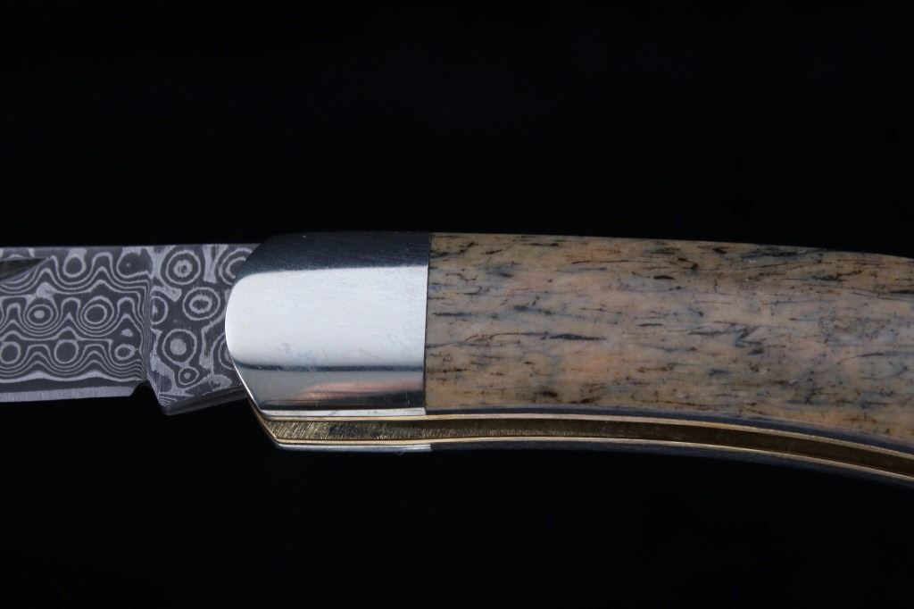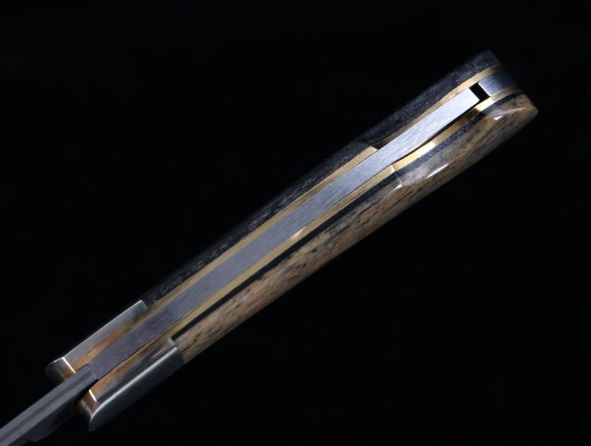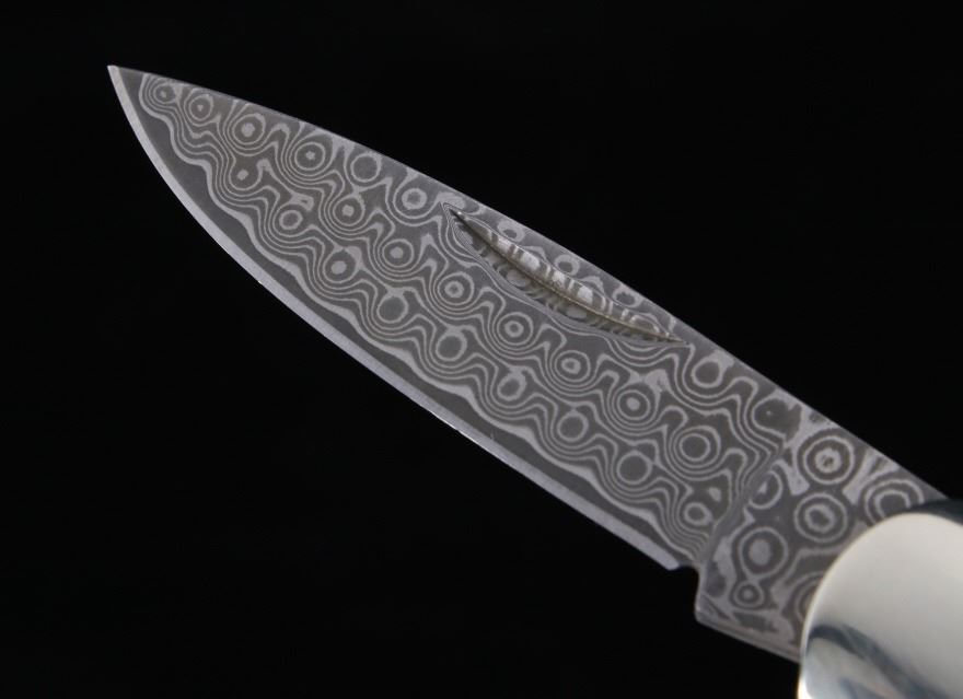 This is an original handmade custom knife showing a folded forged raindrop Damascus blade with excellent premium Wooly Mammoth bone grips. The knife is from Santa Fe Stone-works. The grip shows a nice long piece of Wooly Mammoth bone. The blade shows a "Sanmai Damascus" which has a core of VG-10 "super stainless steel" with 16 layers of SUS410 high carbon stainless steel on each side making an over 33 layer work of art. This is a liner lock knife showing 5 1/4" long knife with the blade measuring 2 1/4". When closed it measures 3 1/4" long. The knife comes with the original Santa Fe Stoneworks Wooly Mammoth box and original paper work. This is a brand new knife.
