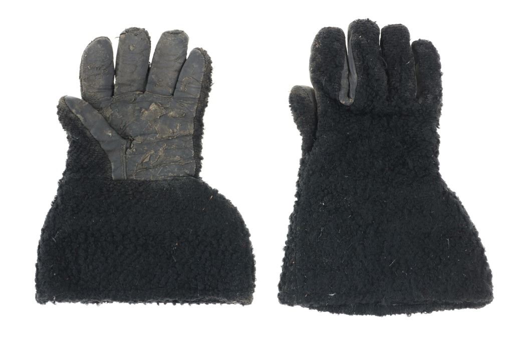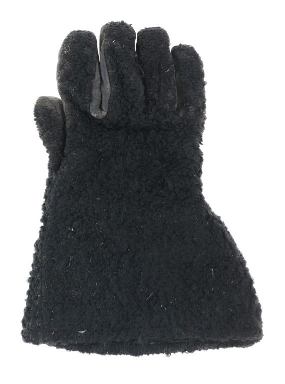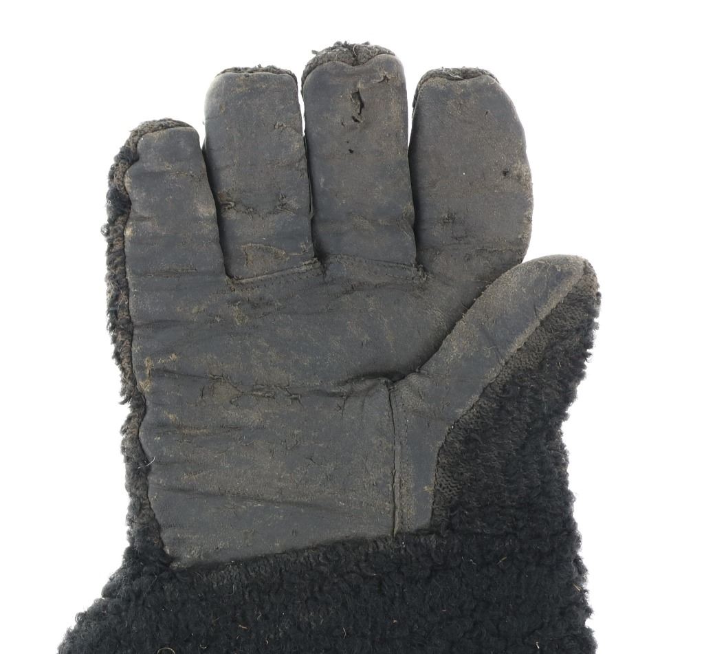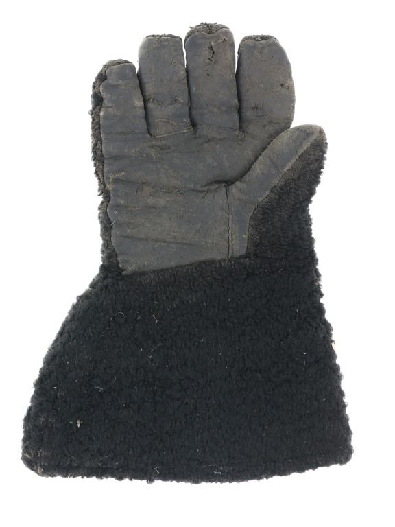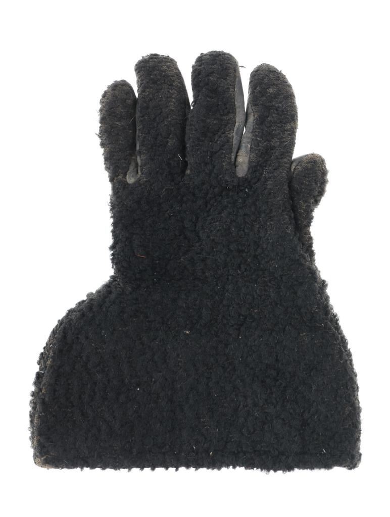 Featured in this lot is a pair of wooly sheep wool military gauntlet gloves, circa 1940s. The gauntlets feature a wonderfully and professionally crafted wooly sheep wool construction with a corduroy lining and hide palms to the gauntlets. The wool is soft and shows black coloration with sewn seams. The condition of this pair of stagecoach gauntlets is good with some dirt and debris caught in the wool with some wear to the seam and to the palm of the gauntlets, but otherwise they show good overall condition. The measurements of this pair of gauntlets are 11"L x 8 1/4"W. The collective weight of this pair of gauntlets is 10oz.*