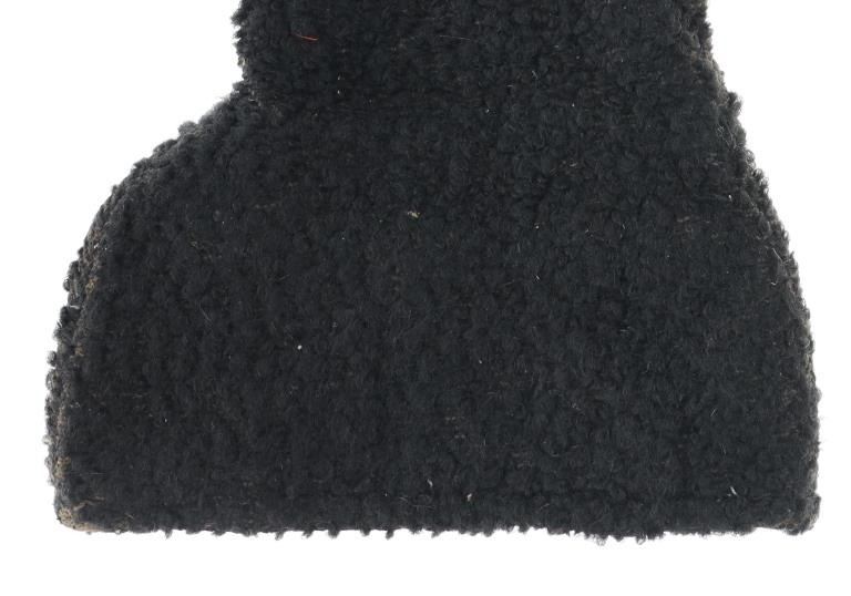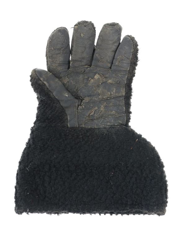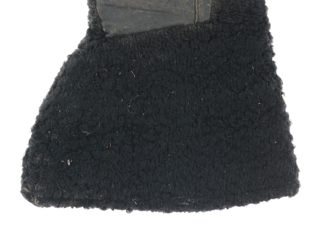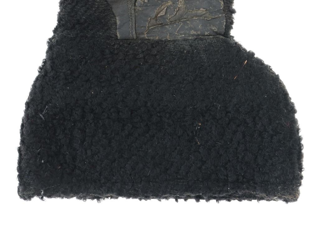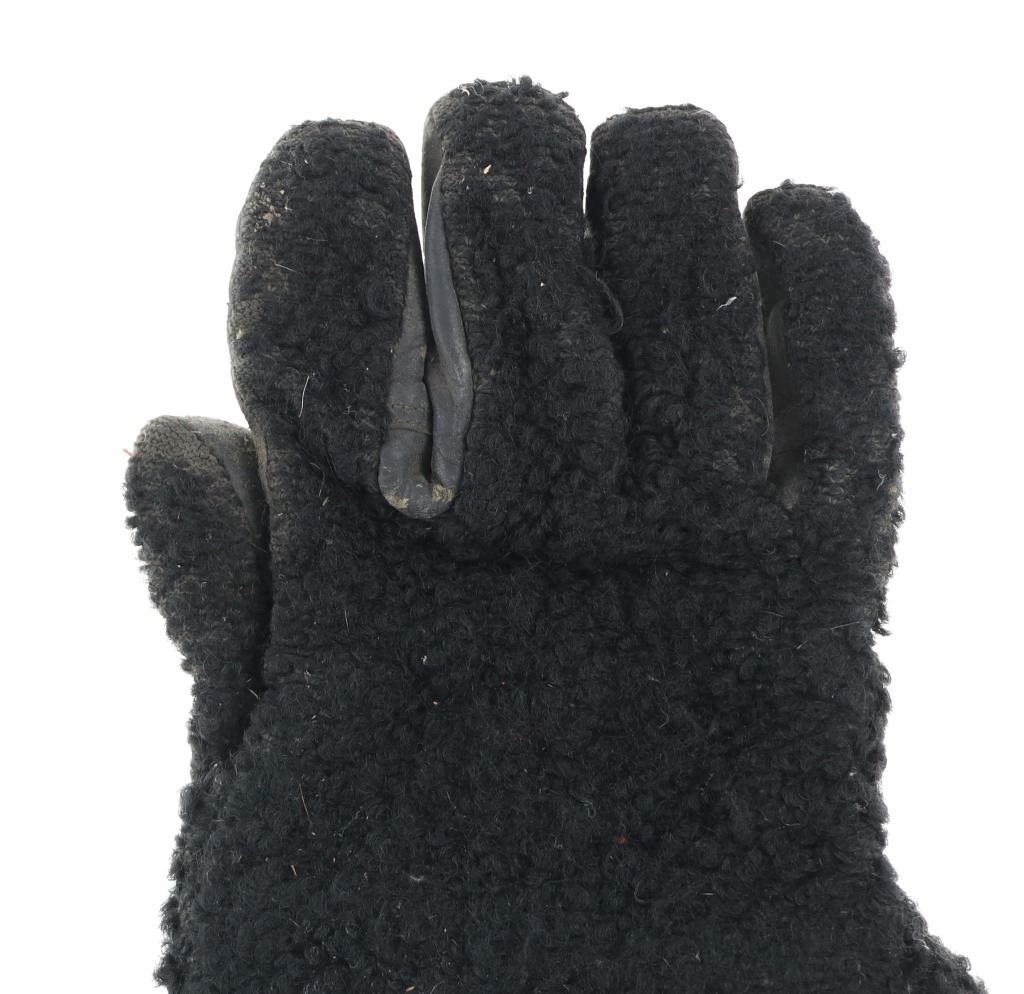 Featured in this lot is a pair of wooly sheep wool military gauntlet gloves, circa 1940s. The gauntlets feature a wonderfully and professionally crafted wooly sheep wool construction with a corduroy lining and hide palms to the gauntlets. The wool is soft and shows black coloration with sewn seams. The condition of this pair of stagecoach gauntlets is good with some dirt and debris caught in the wool with some wear to the seam and to the palm of the gauntlets, but otherwise they show good overall condition. The measurements of this pair of gauntlets are 11"L x 8 1/4"W. The collective weight of this pair of gauntlets is 10oz.*