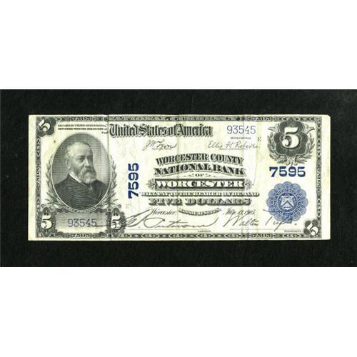 <B>Worcester, MA</B></I> - $5 1902 Plain Back Fr. 598 <B>Worcester County NB</B></I> Ch. # 7595<BR> Cashier C.S. Putnam served more than one president of this bank. This <B>Very Fine</B></I> note is bright for the grade.<BR><I>From The Walla Walla Collection</B></I><BR><BR><b>Shipping:</b> Coins & Currency (<a target="_blank" href="http://www.heritageauctions.com/common/shipping.php">view shipping information</a>)