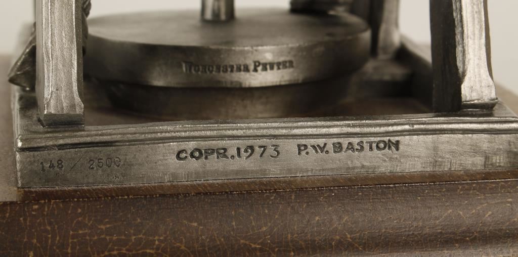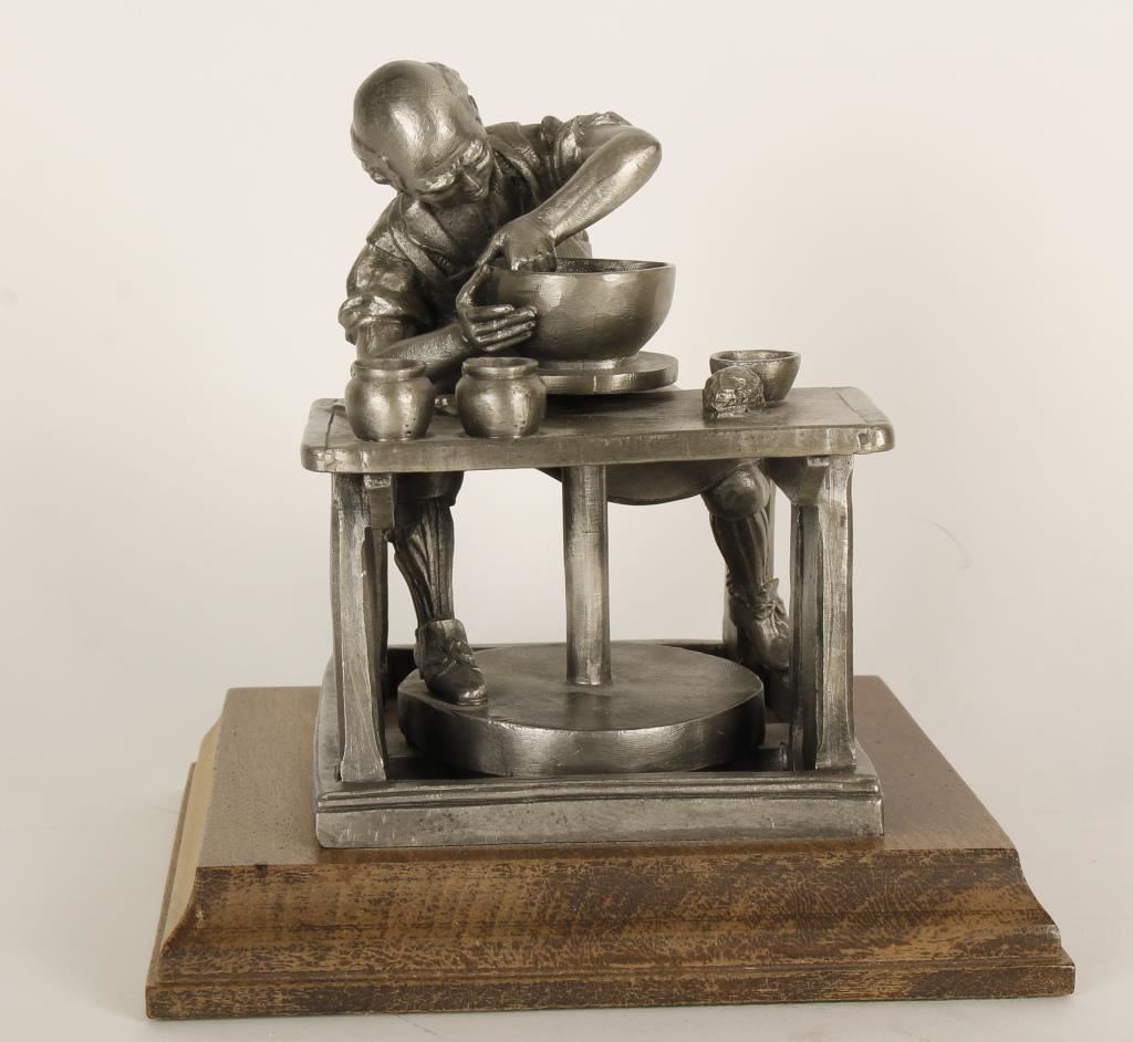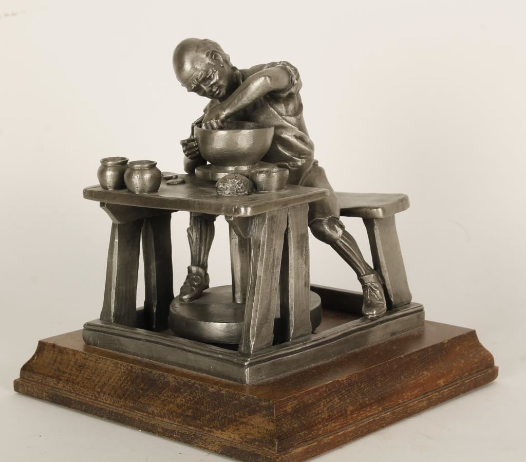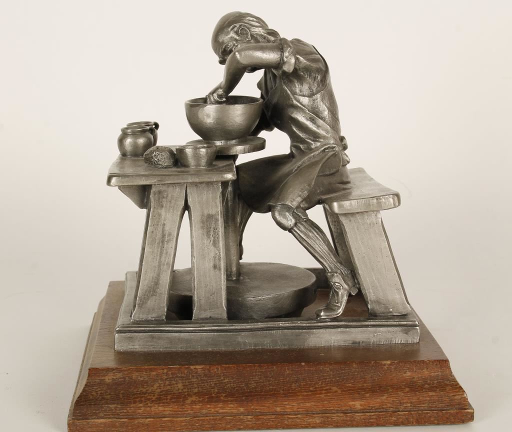 Artist P.W. Baston entitled "The Potter" on oak base. Measures 9"x6"x6".Measures stamped on base.