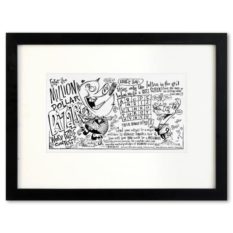 Enter a surreal and satirical world of twisted imagination and award winning creativity. "Word Puzzle" is an original pen & ink drawing on paper by Dan Piraro, creator of the critically acclaimed and award winning comic strip, Bizarro. This piece is hand signed, comes custom framed and includes a letter of authenticity. Measures approximately 14" x 21" (frame), 7" x 13" (image).This item requires special handling and may have a longer than usual turnaround.