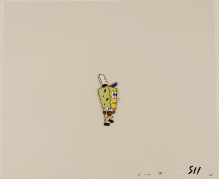 This original animation cel is from the Nickelodeon TV show SpongeBob Squarepants. The story takes place under the deep blue sea in Bikini Bottom, where SpongeBob resides. SpongeBob, who is a yellow, porous sponge, is your typical happy-go-lucky character, as he is always cheerful and enjoys making people laugh. Patrick Star, SpongeBob's neighbor who is a starfish, is your average children's show idiot, as he boasts knowing nothing and is often getting himself into ridiculous situations. Between the homes of these two lies the home of the miserable Squidward, a squid, who is known for being grouchy and playing tricks on SpongeBob and Patrick. Both SpongeBob and Squidward work at the Krusty Krab, a fast food business run by the greedy money-loving Mr. Krabs, a crab, the arch rival of the evil, possibly misunderstood, Plankton. Another neighbor, Sandy Cheeks, an athletic squirrel who normally wears an astronaut's space suit, was introduced in "Tea at the Treedome." She spends most of her time inventing and experimenting. SpongeBob is wearing his work uniform.Original Production Animated Cel Overall Size of Cel: 10 1/2" x 12 1/2" Very Good ConditionThis is an original hand-painted cel set-up used in the production of an episode of "SpongeBob SquarePants." Each one-of-a-kind set-up represents a slight change in position of the characters. When individually photographed and projected in rapid succession, the images appear to move.