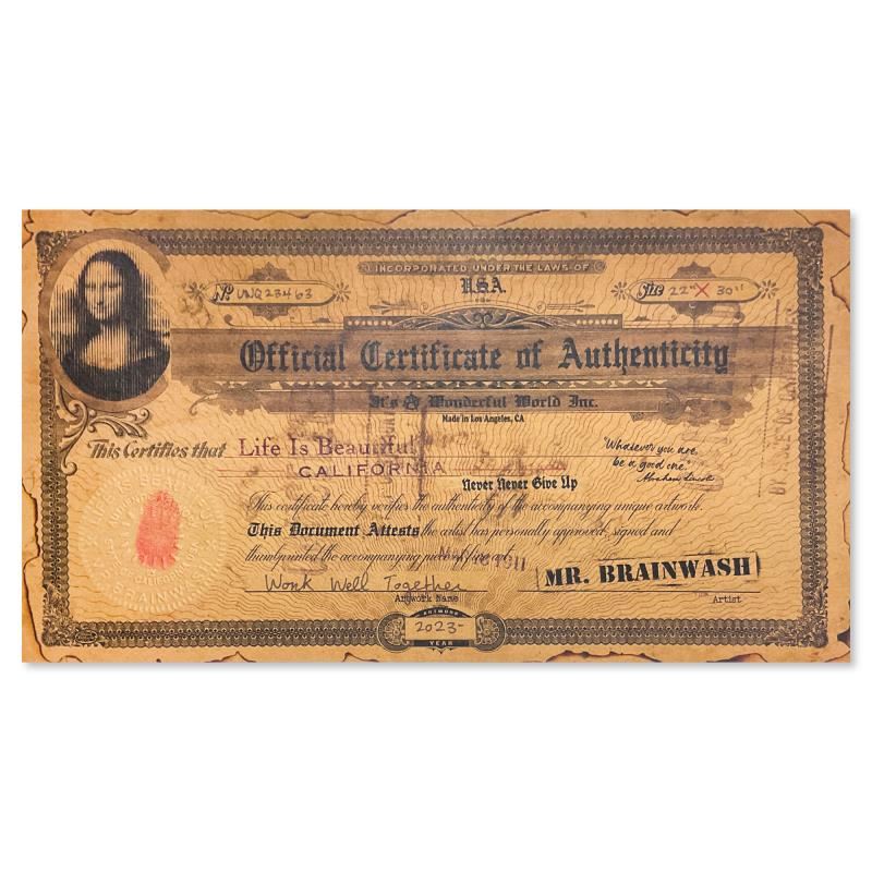 "Work Well Together" is a unique (UNIQ) mixed media on deckle edge paper by Mr. Brainwash, hand signed and bearing the thumbprint of the artist inverso. This piece comes custom framed. Includes Certificate of Authenticity. Measures approx. 26" x 34" (frame), 22" x 30" (image).