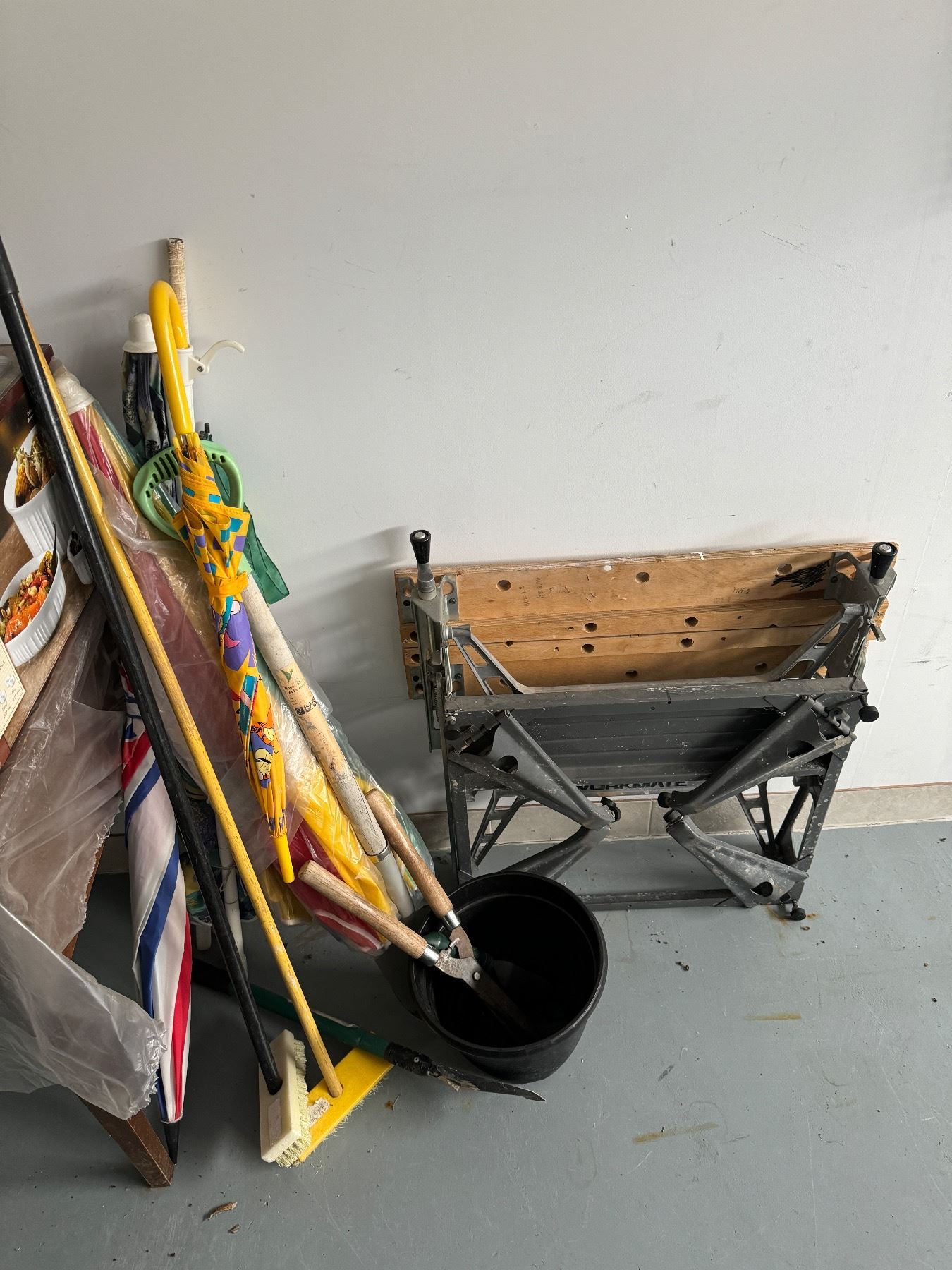 Work bench umbrellas and other brushes and yard items