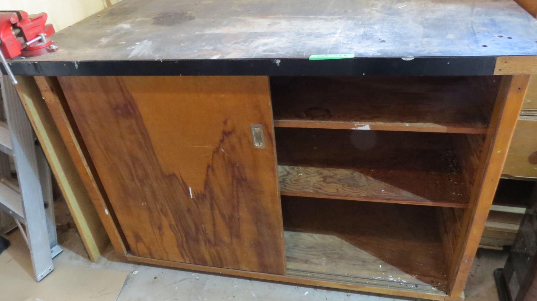 Work bench with attached vise (sliding doors + shelving) on casters - 60x30x39