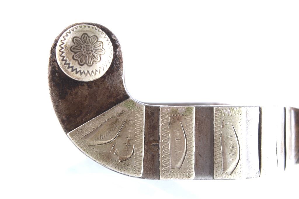 For your consideration is this pair of Crockett Style Silver Mounted Working Cowboy Spurs, circa 1930s-1940s. Used as a device to control their steeds, the spurs have become one of the most important items a Cowboy can own. Historic and famous makers such as Crockett are sought after by collectors. These spurs have traditional Crockett design tooled silver on shanks and buttons, oversized 2.25" diameter 20 flat point rowel on one spur, rowel missing from other spur, heavy duty chap guards, very rich patina throughout. 3.25" heelband opening, overall 4.25"W x 7.25"L