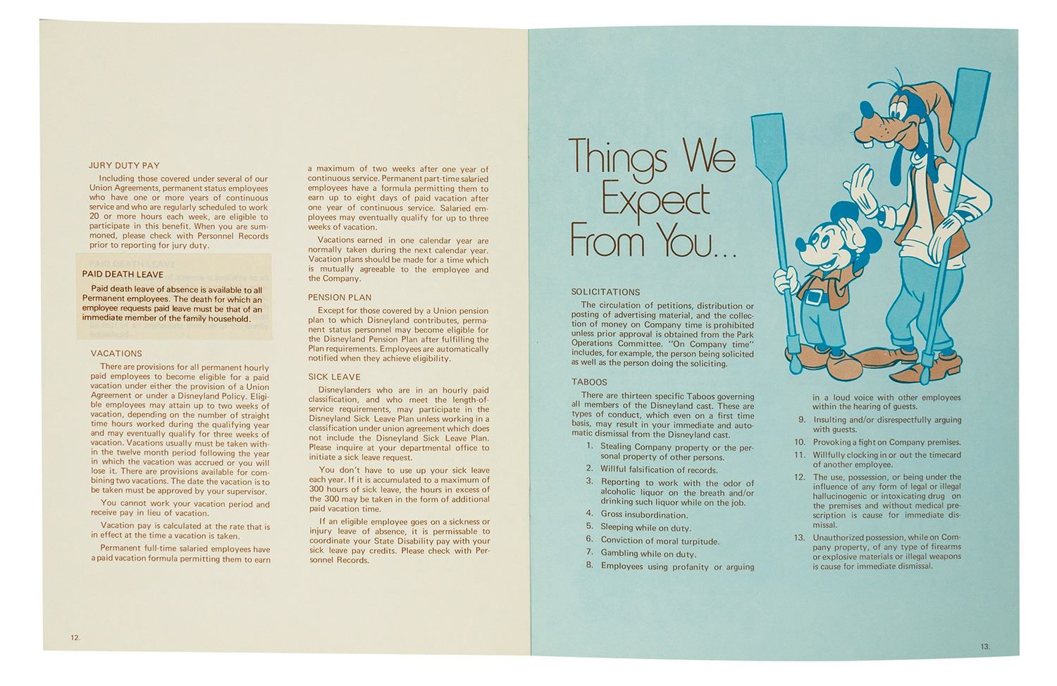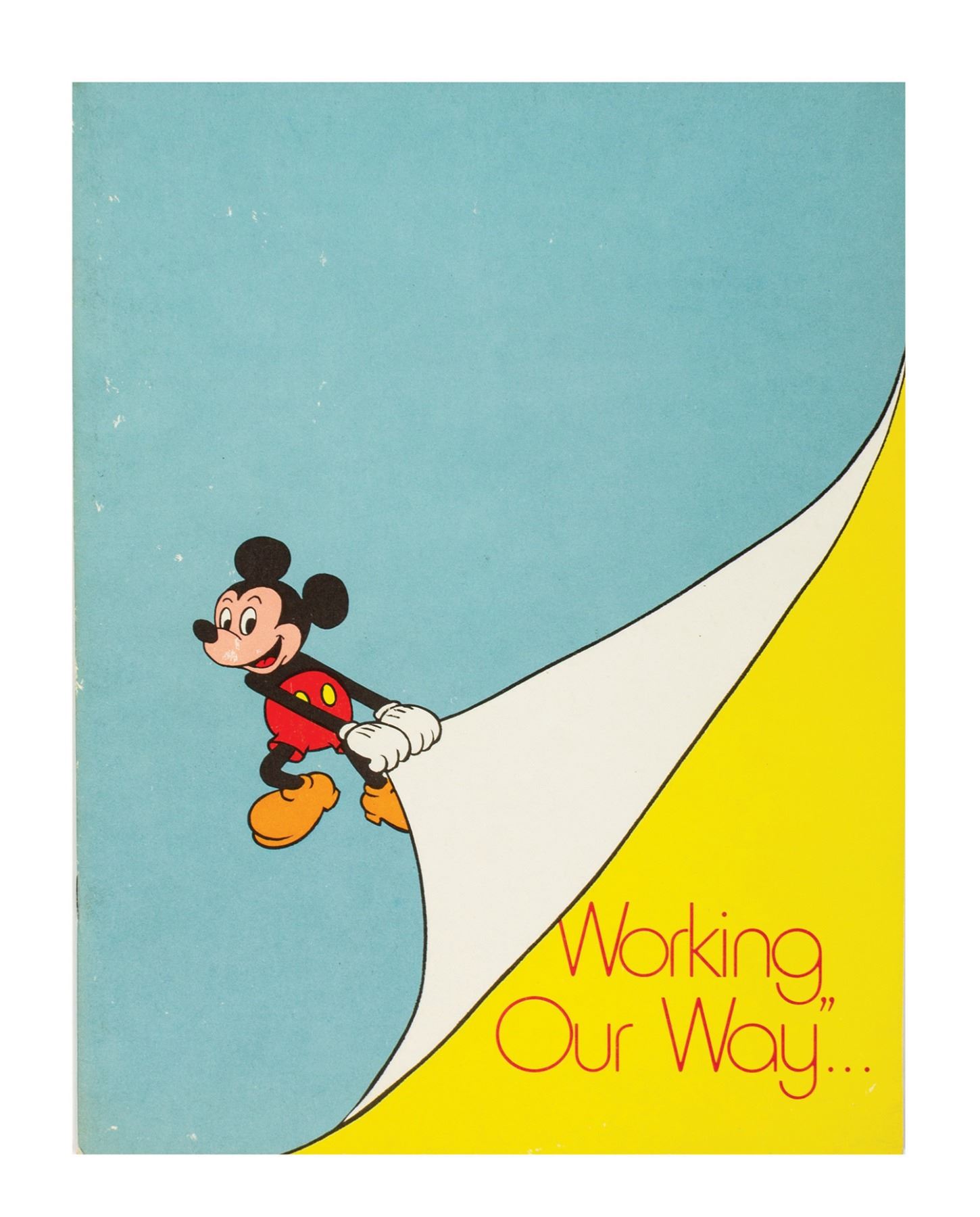 (Disneyland, 1974) A Disney University guidebook titled, "Working, Our Way...". The manual contains policies, practices, and procedures expected of the park's employees. The 16-page manual measures 11"x8.5" and is in good condition with scuffing and light creasing to the cover.