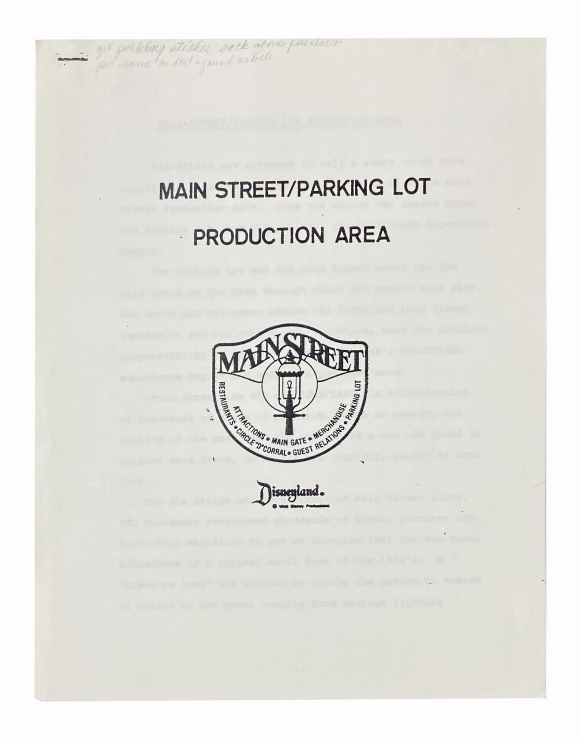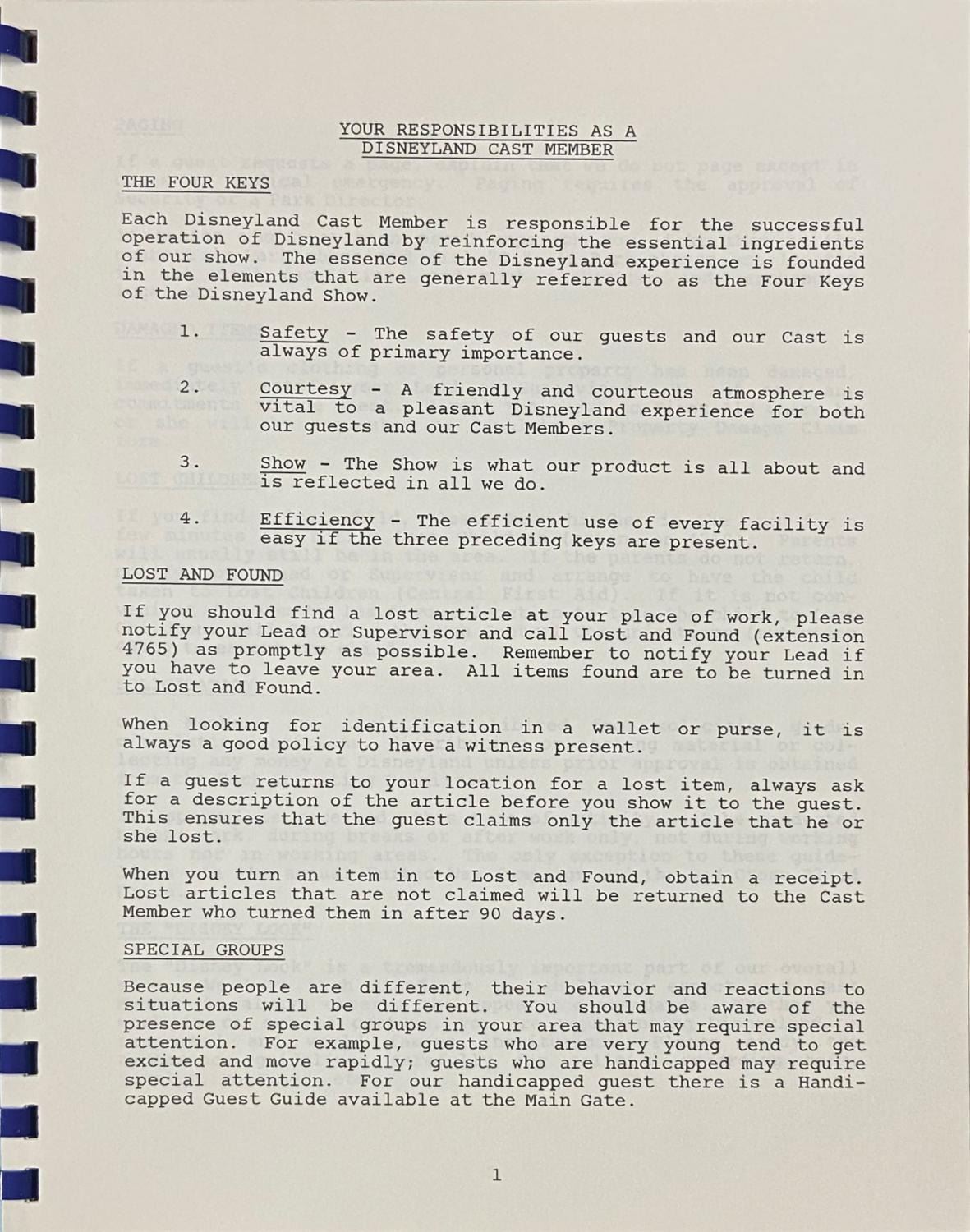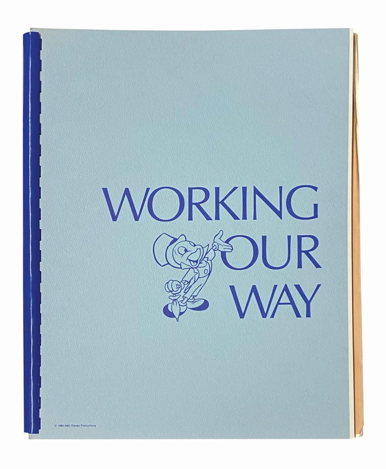(Disneyland, 1984) A spiral-bound handbook titled "Working Our Way" which details the policies and procedures of being a cast member. Additionally, a National Fantasy Fan Club membership application and Main Street/Parking Lot Production Area guide with handwritten notes are tucked into the handbook. Measuring 11"x8.75", the handbook is in very good condition with some edge-wear from use, and some curling to the pages which have been tucked into the handbook. The production area guide is stapled, and the rusting staple has left marks on the pages where it was inserted.