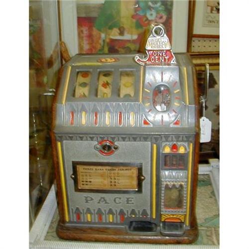 Early 1930's Pace working one cent slot machine mounted on a wood board. The pace Mfg. Co. is in Chicago, Ill. I have the keys. There is one screw that I can't get down, but it does not effect the working of the great slot machine. Buyer pays shipping and handling costs.