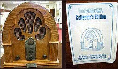 Working Thomas Collectors Edition Radio Model 1932-0/1932FH with original instruction manual. All in good exterior condition. No box, tuning works, volume works, has cord. Cassettes go in the side of the case. Stands 12 1/2" tall.