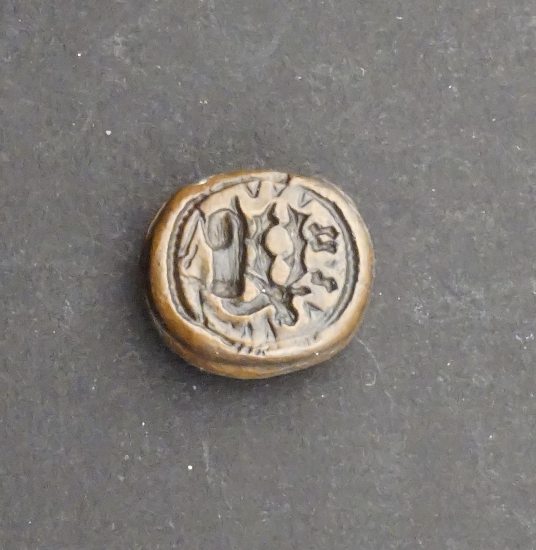 Small Brass seal of Jumping Stag left w/ I.U. above Oval-15, 4.8 grams. Very well made.