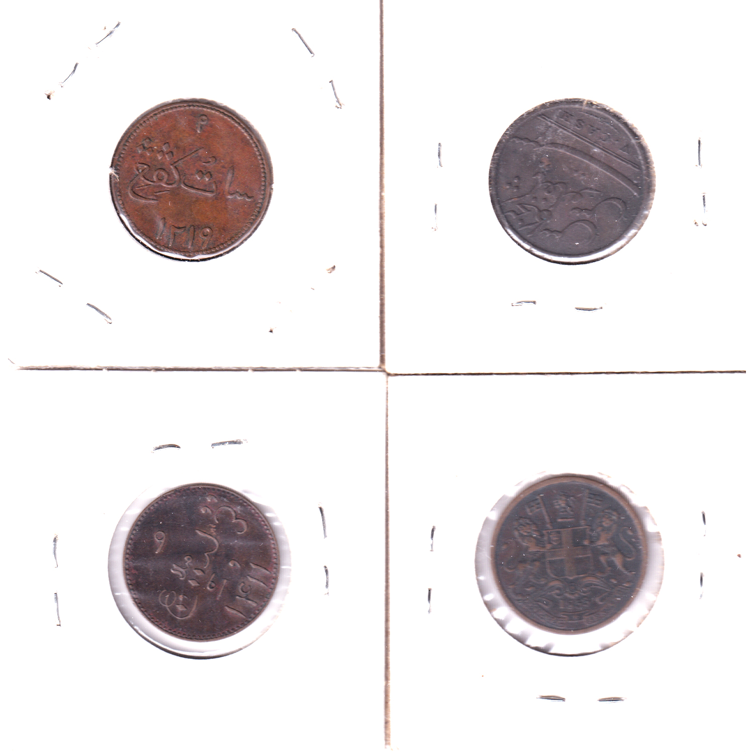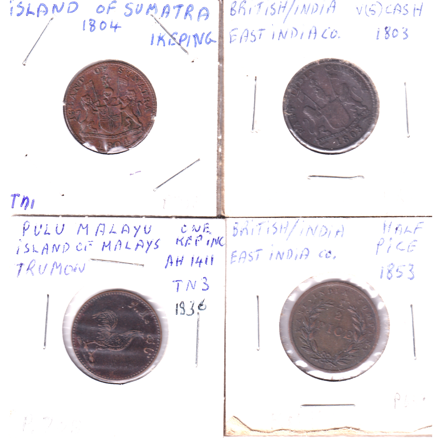 INCLUDES: British India 1803 5 Cash, Netherlands East Indies Island of Sumatra 1804 1 Keping, British India 1853 1/2 Pice & Netherlands East Indies 1836 1 Keping. 4pcs