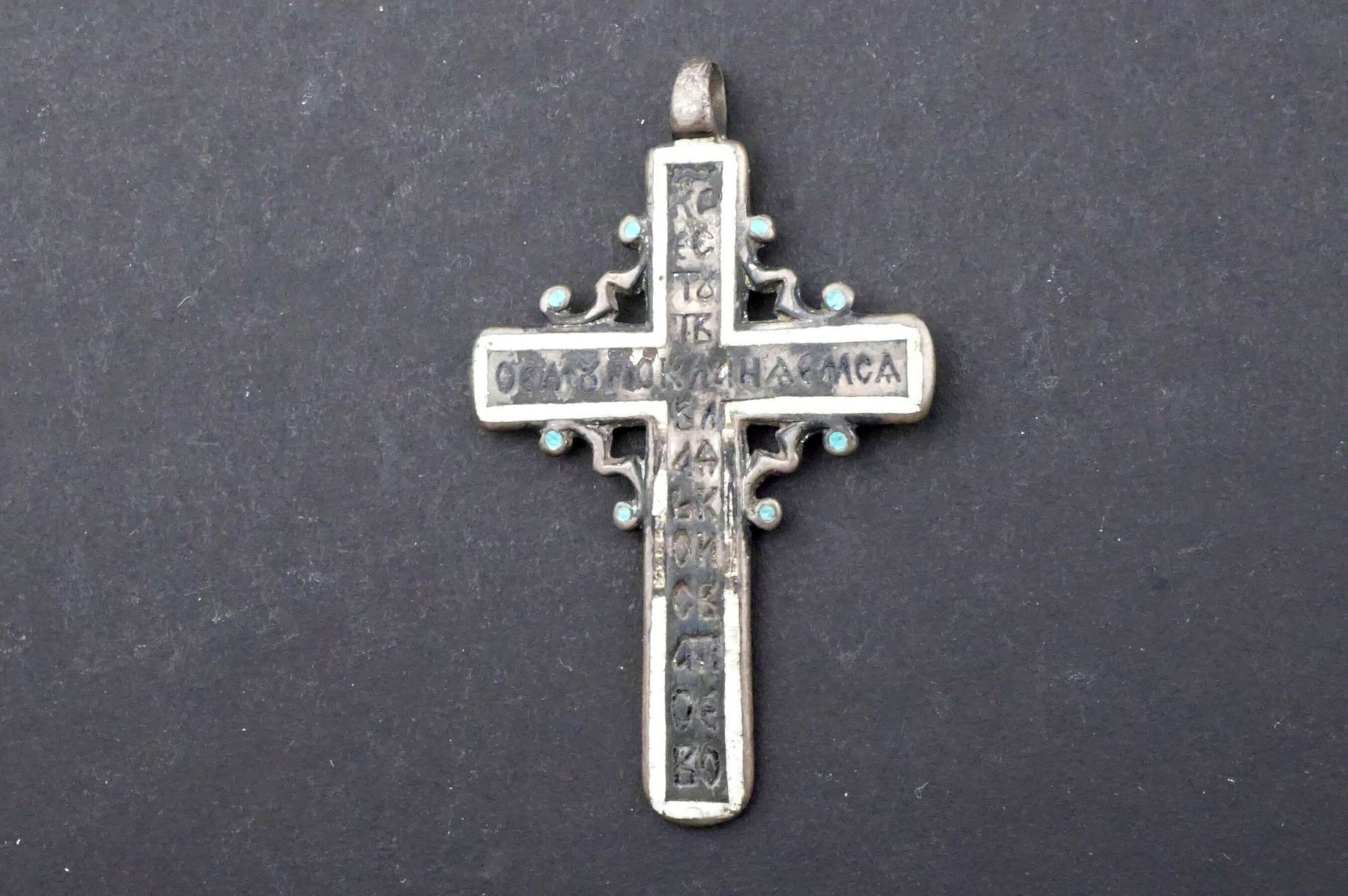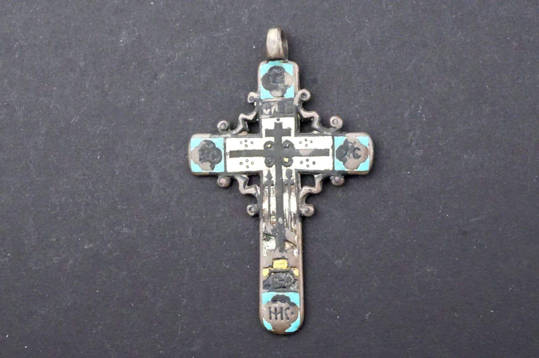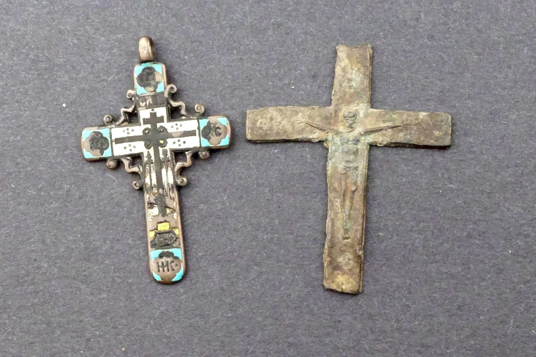 2 pcs.1- Russian cloisonné silver. 10.3 grams some chipping 2nd. Plain uniface cast cross w/Christ 57 mm with broken top loop. Comes with a handwritten document attesting it was found on Champlain St. in Québec City in 1860. Unique.