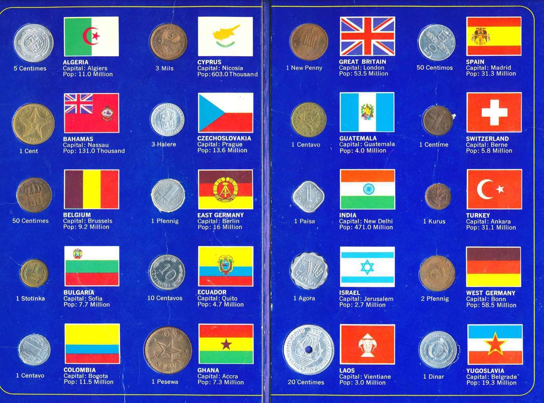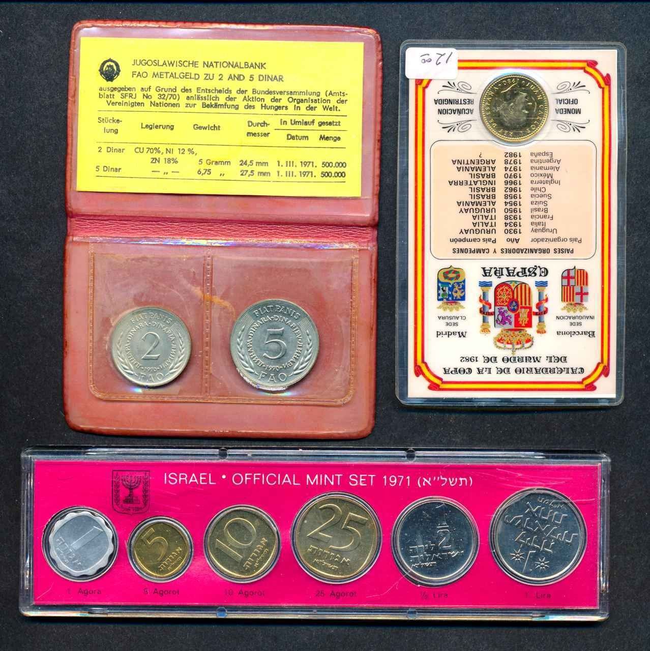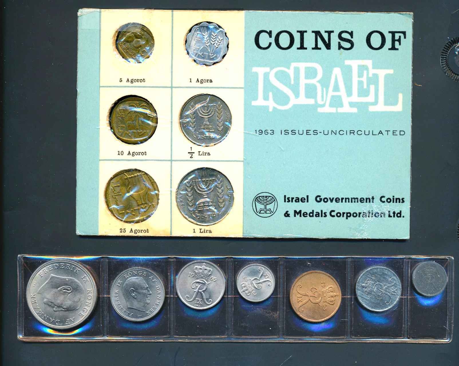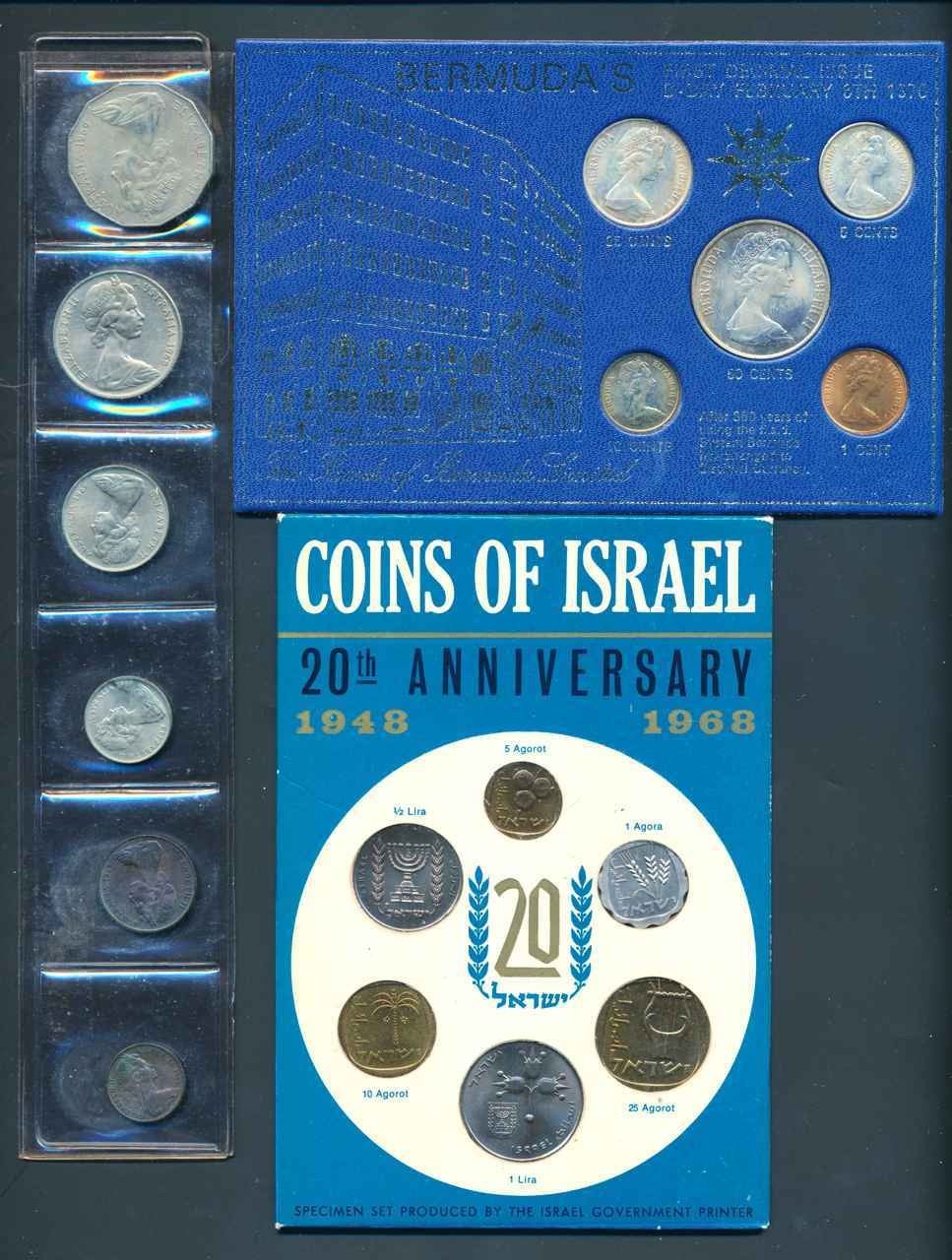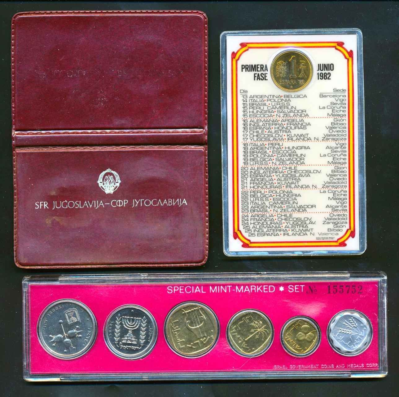1 x Gulf Oil Canada Set of 20 World Coins 1952-1970 in holder, 1 x 1963 Isreal Year set, 1 x 1968 Isreal Year set, 1 x Denmark MS-2 1963-1965 Year set, 1 x 1970 Bermuda First Decimal Issue 5 coin Bank of Bermuda set, 1 x Australia MS-2 6 coin year set, 1 x Yugoslavia 2 coin FOA set in National Bank holder, 1 x 1971 Isreal Year set and 1 x 1982 FIFA Spanish World Cup schedule card with 1 peseta coin.