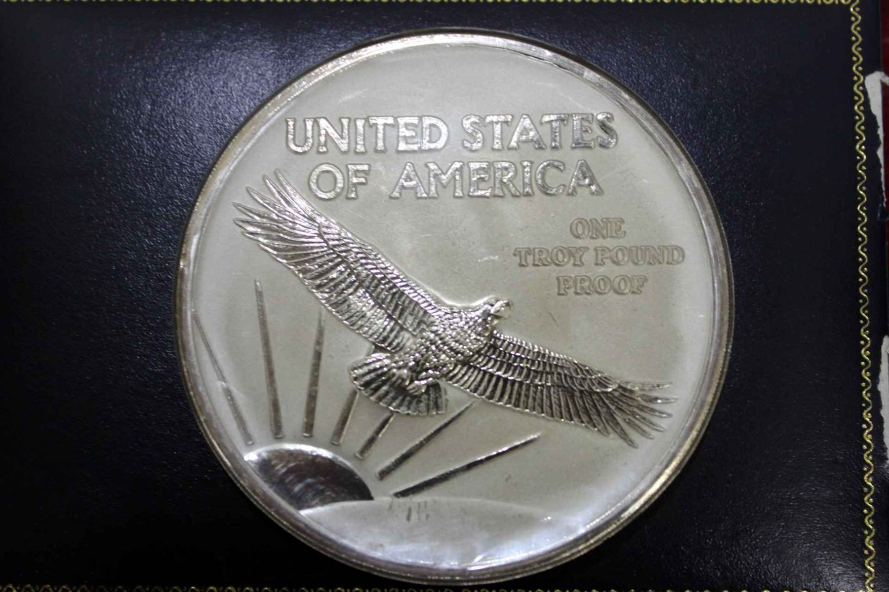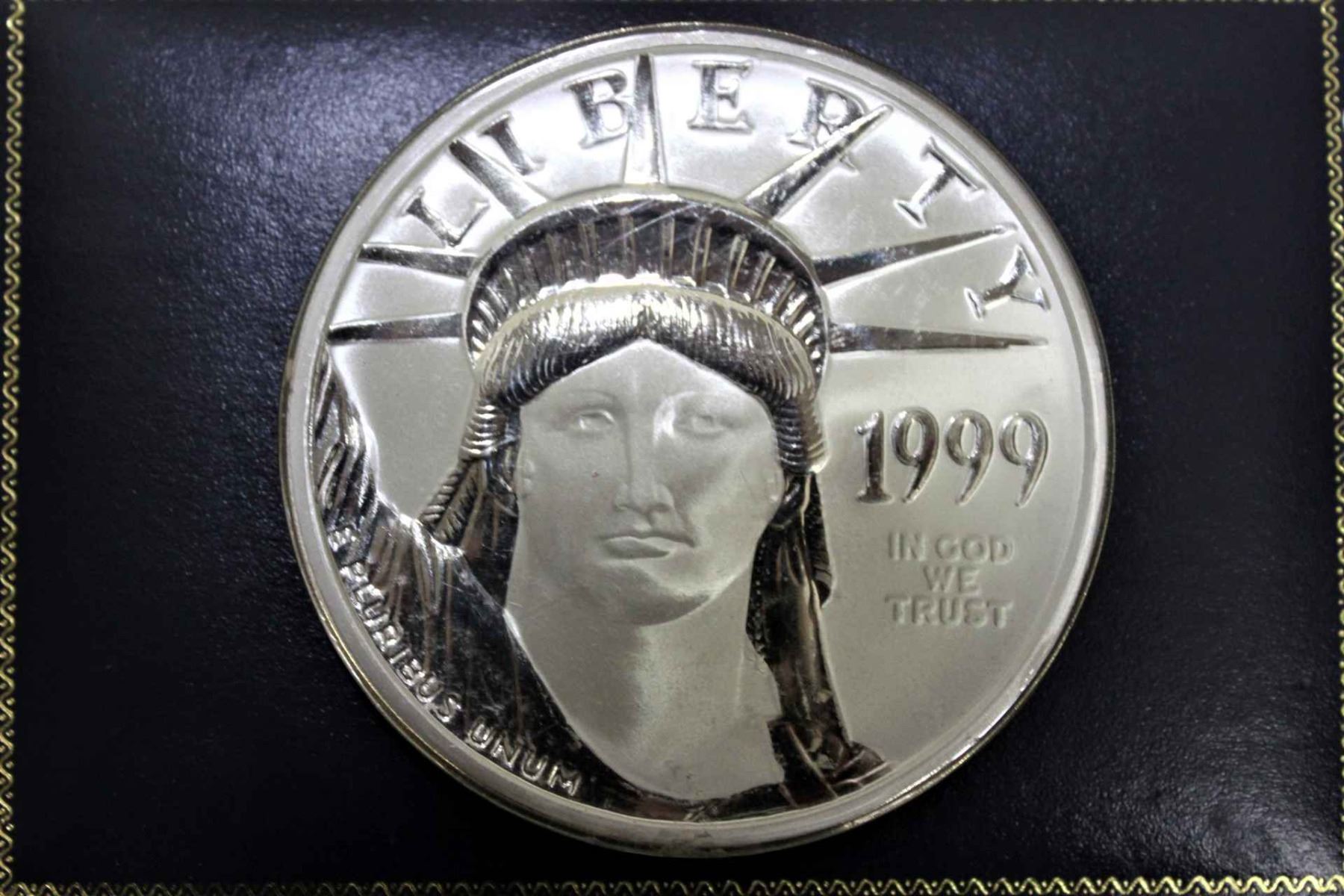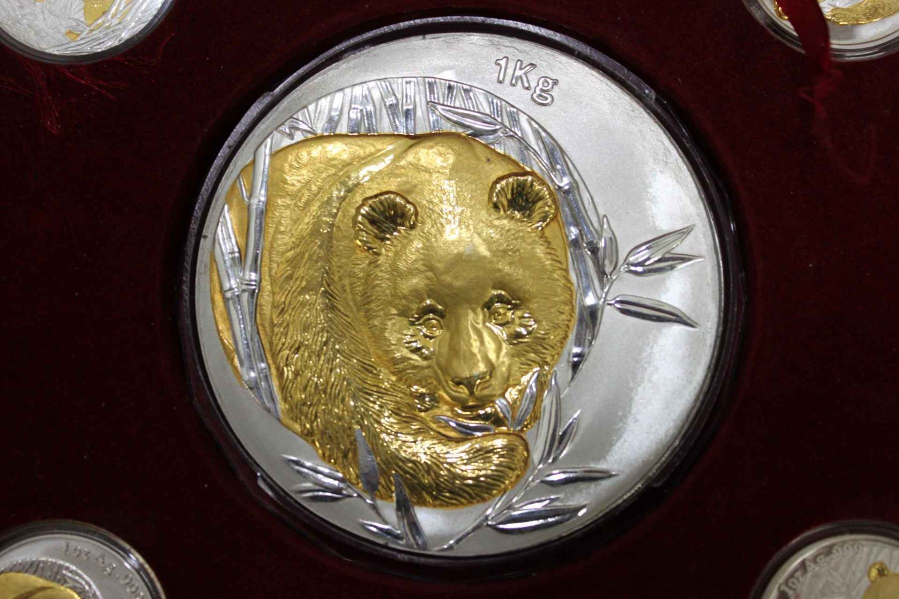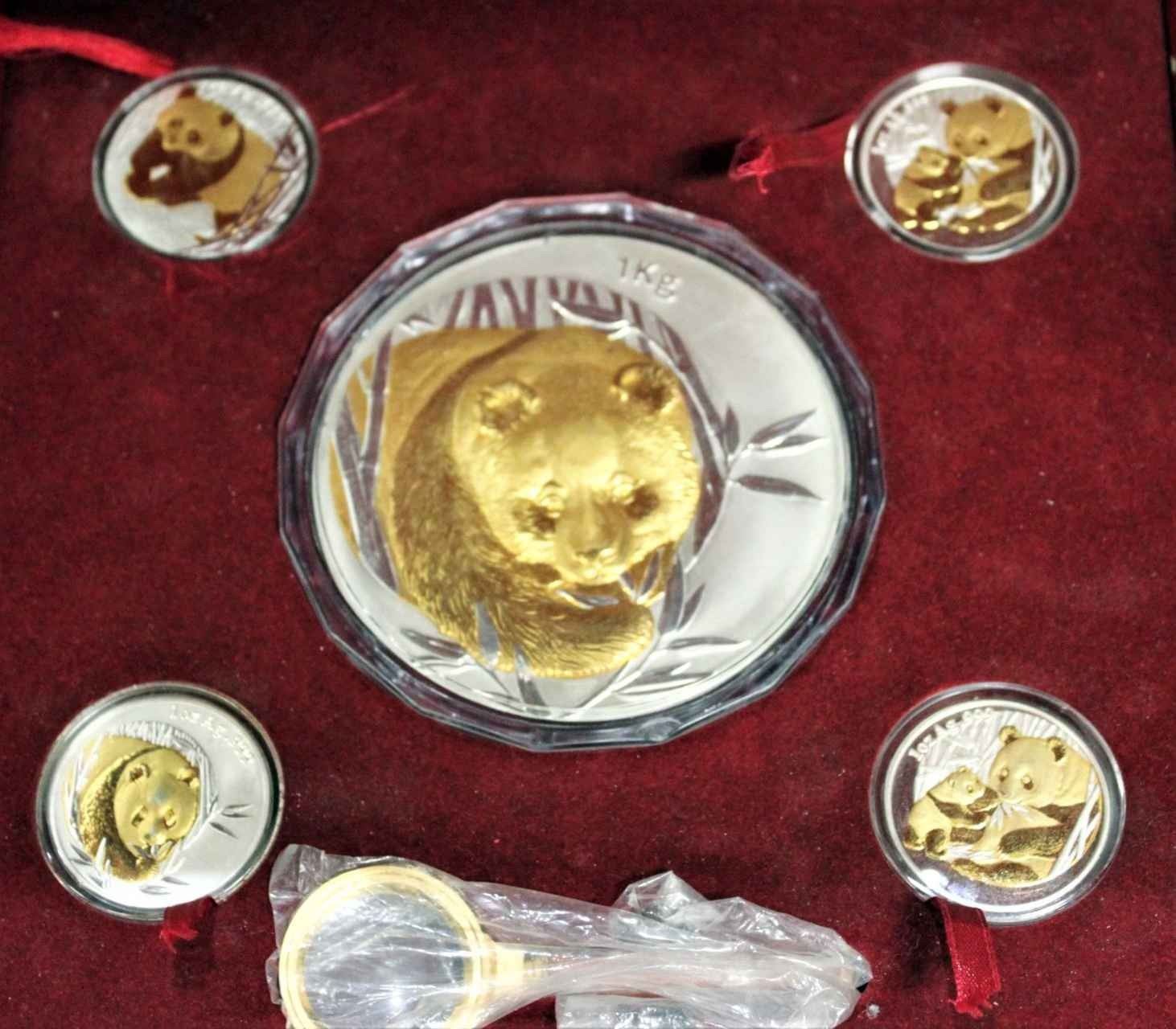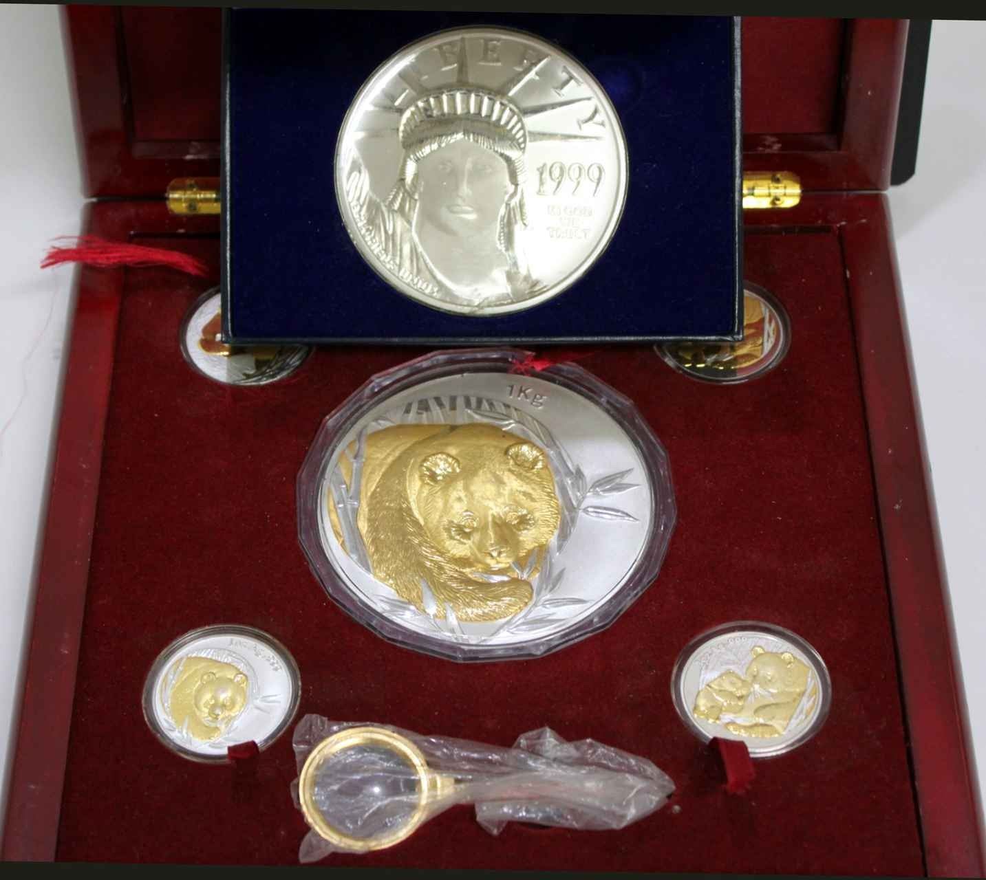 1 x China Panda 5 coin set with a Kilo coin dated 2005 along with 4 x 1 Oz. dated 2 x 2001, 1 x 2005 and 1 x 2003. Comes in a 270 x 270 mm red lacquered wood box. Though the 2003 coin was marked 1 Oz. 999 we had that coin XRF'ed for metal content. The results were 83.0 % copper, 7.24 % silver and 9.89 % nickel.Actual weight on the coin tested was 27.4 gms. The coin marked 1 kilo weights in at 629.8 gms. The second offering is a 1999 One Troy Pound Proof plated in Platinum. Comes in a blue rectangular box.