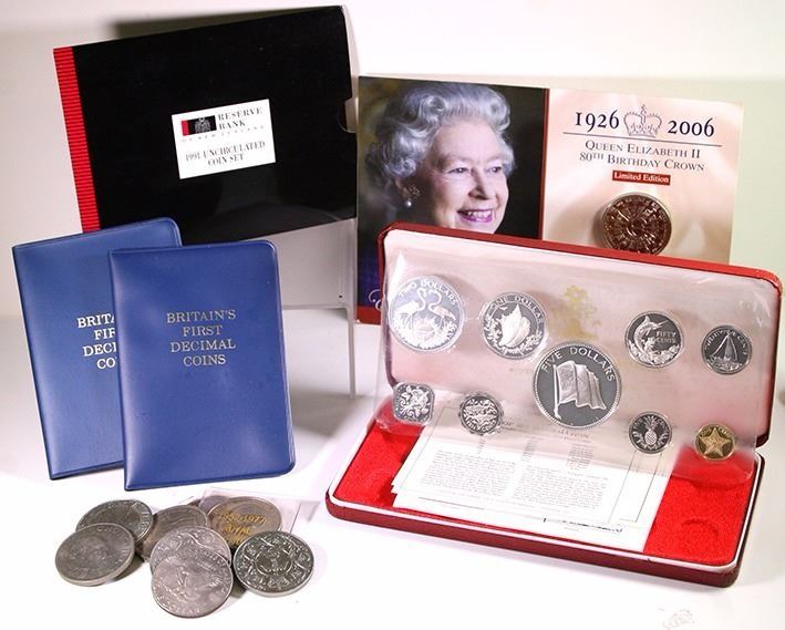 Bahamas, proof set, 1975, containing the silver Fifty Cents, One, Two and Five Dollars (KM.PS.12 total ASW 2.8721); together with New Zealand uncirculated set, 1991 (KM.MS.38); Great Britain uncirculated set, 1971 (2); plus Great Britain private issue predecimal set, 1966; miscellaneous British and World Crown size coins (26) and Roman reproduction coin set, mixed condition (lot)
