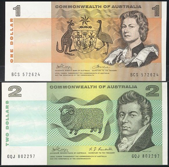 World Banknote Lot; Australia 1972 $1 P#37 & $2 P#38 AU to UNC. Lot of 2 notes
