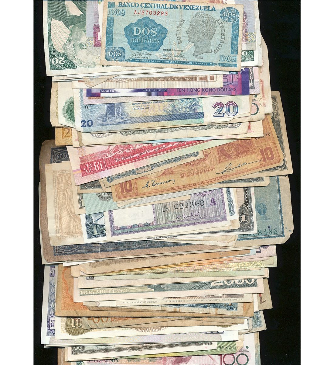 World Banknote Lot; includes 100 issues worldwide, British Commonwealth, Mexico, Portugal, Russia,