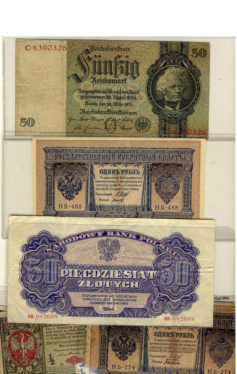 World Banknotes, small lot of European notes: Germany, Russia, Poland, includes 6 notes. Should be viewed.